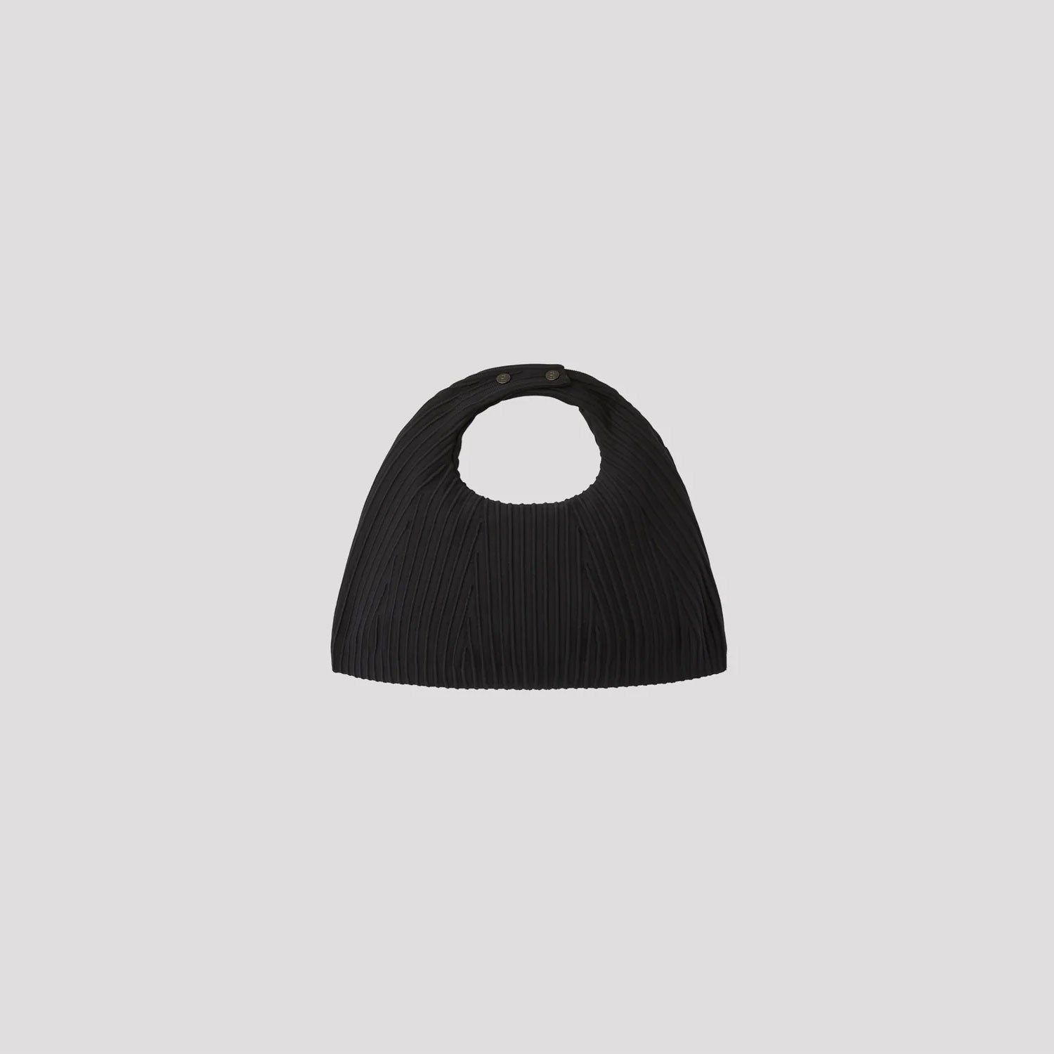ピンタックを用いた立体感のあるストライプ状の編み地と、丸みのあるシルエットがユニークなバッグ。財布や携帯電話が入るサイズで、左右のファスナーからアクセスでき、機能的なデザインです。