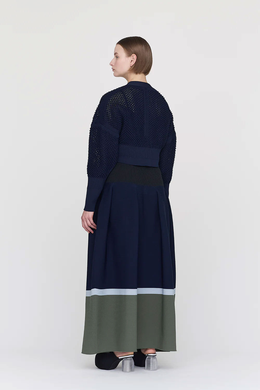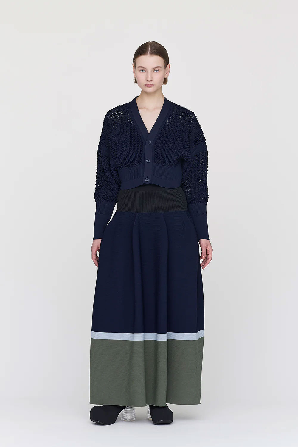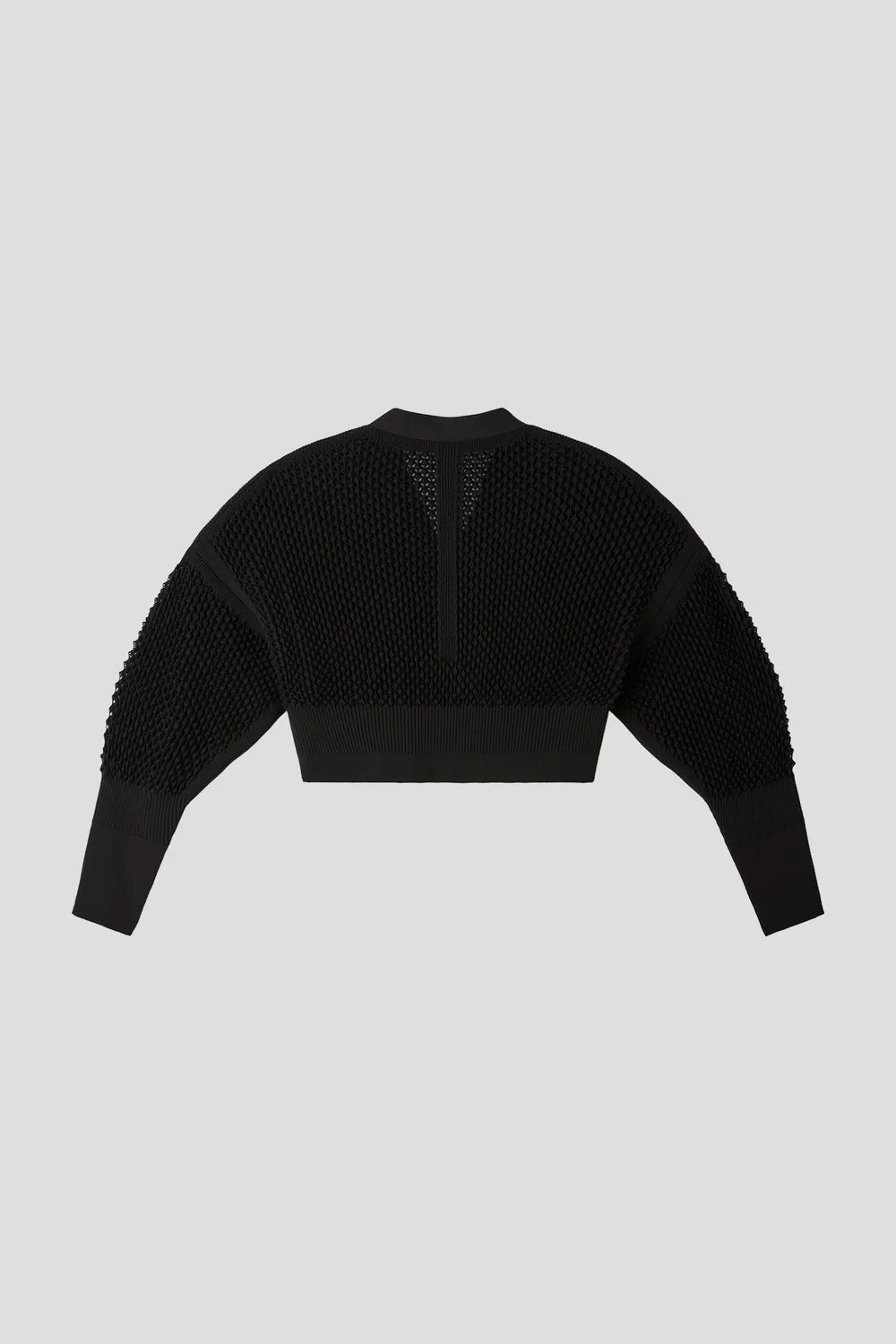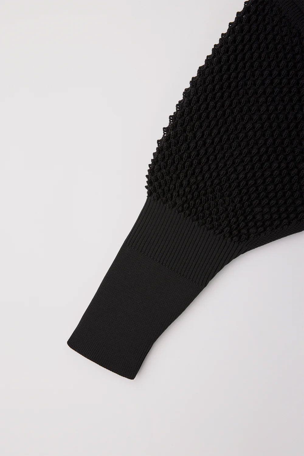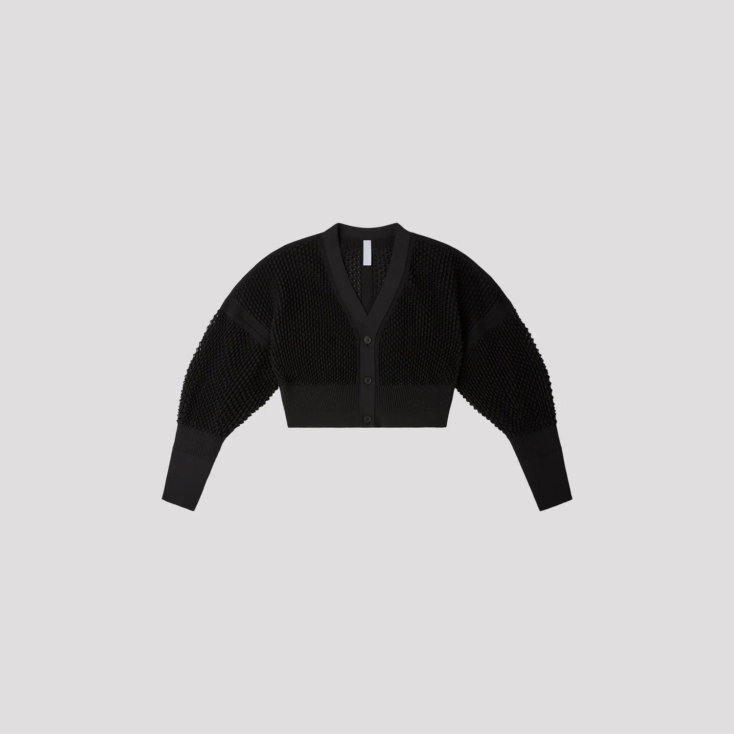 ワッフル編みのテクスチャが特徴の透け感のあるカーディガン。立体的な編み地で、ゆったりとした身頃とボリューム感のあるパフスリーブに、タイトなリブの袖口がアクセントとなるシルエットです。クロップド丈はさまざまなスタイリングに合わせやすく、着こなしの幅を広げてくれます。