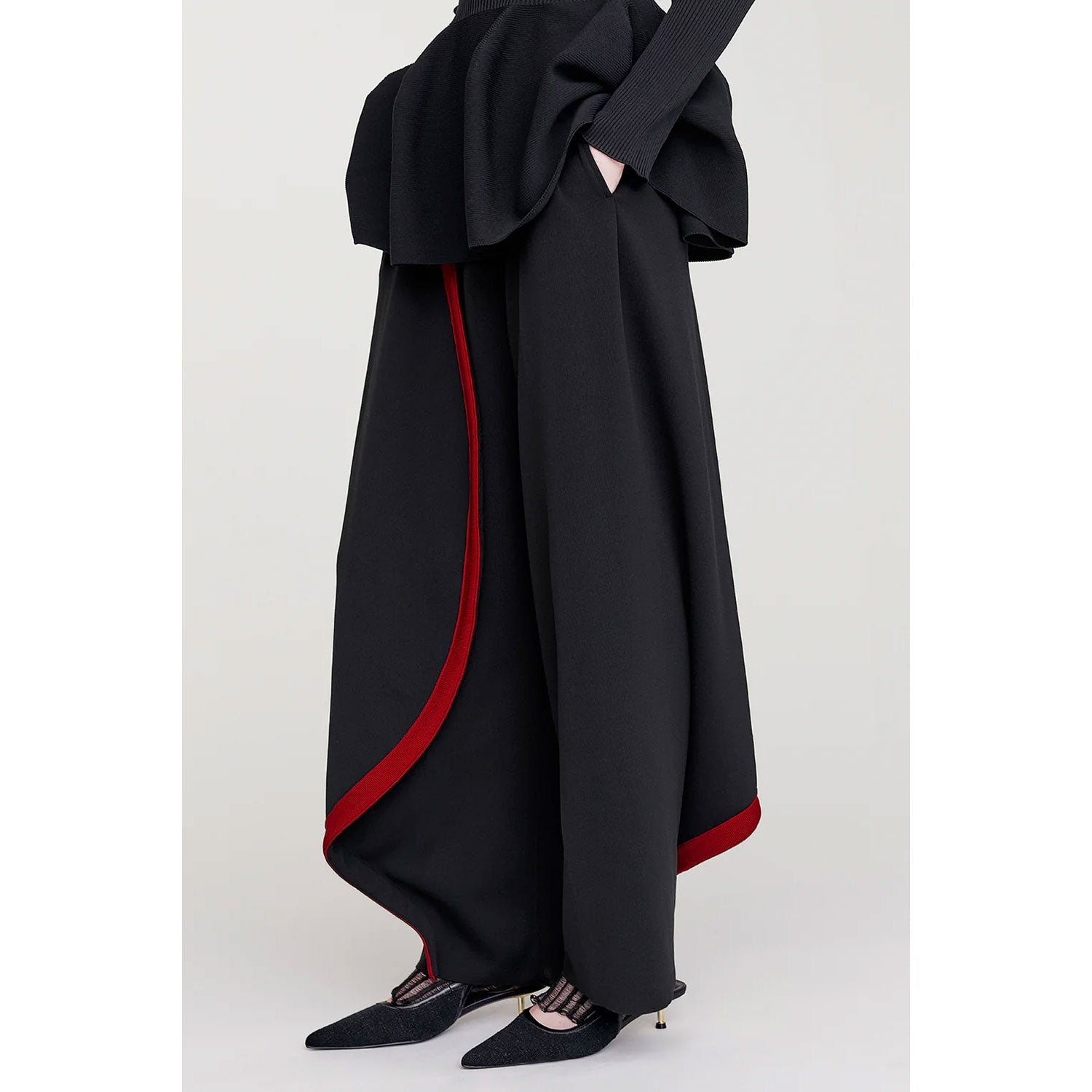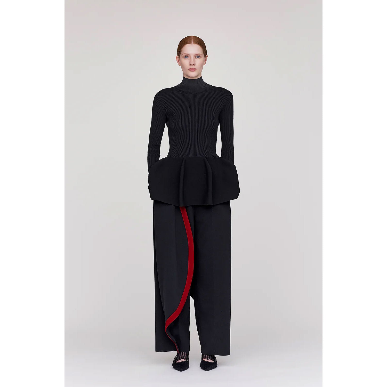 ソリッドなミラノリブのパンツ。ボリュームのあるシルエットに、大きな円形のラインを縁取るパイピングが、大胆で印象的なフォルムを引き立てます。