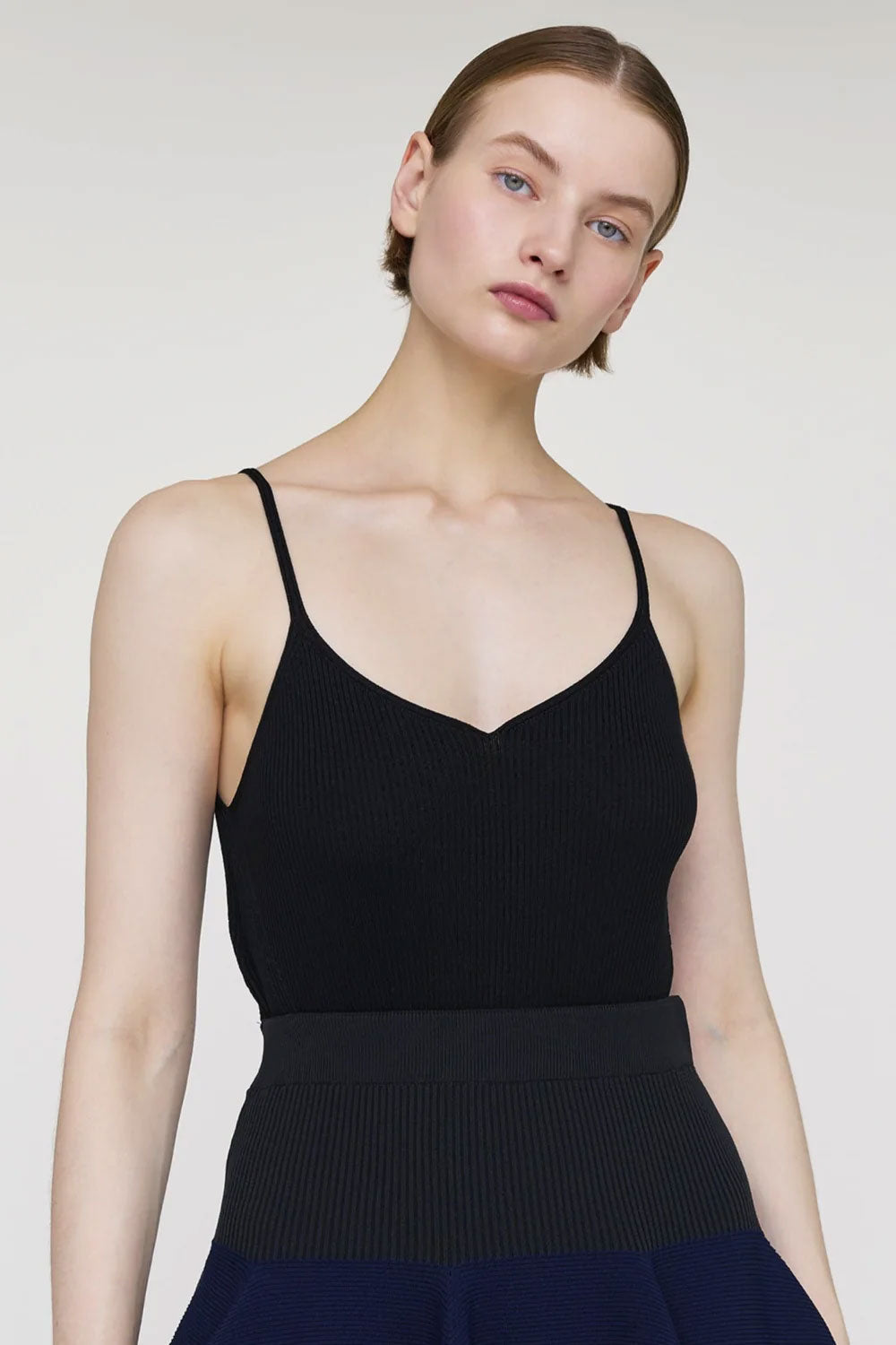 タイトフィットなキャミソールトップ。コンピュータープログラミングによって設計されたリブのラインがシャープな印象で、光沢のある糸を用いた編み地が程よい上質感を与えてくれます。一枚ではもちろん、インナーやレイヤードアイテムとしても活躍し幅広い着こなしが可能です。縫代がなく、ストレッチ性に優れ、快適な着心地です。