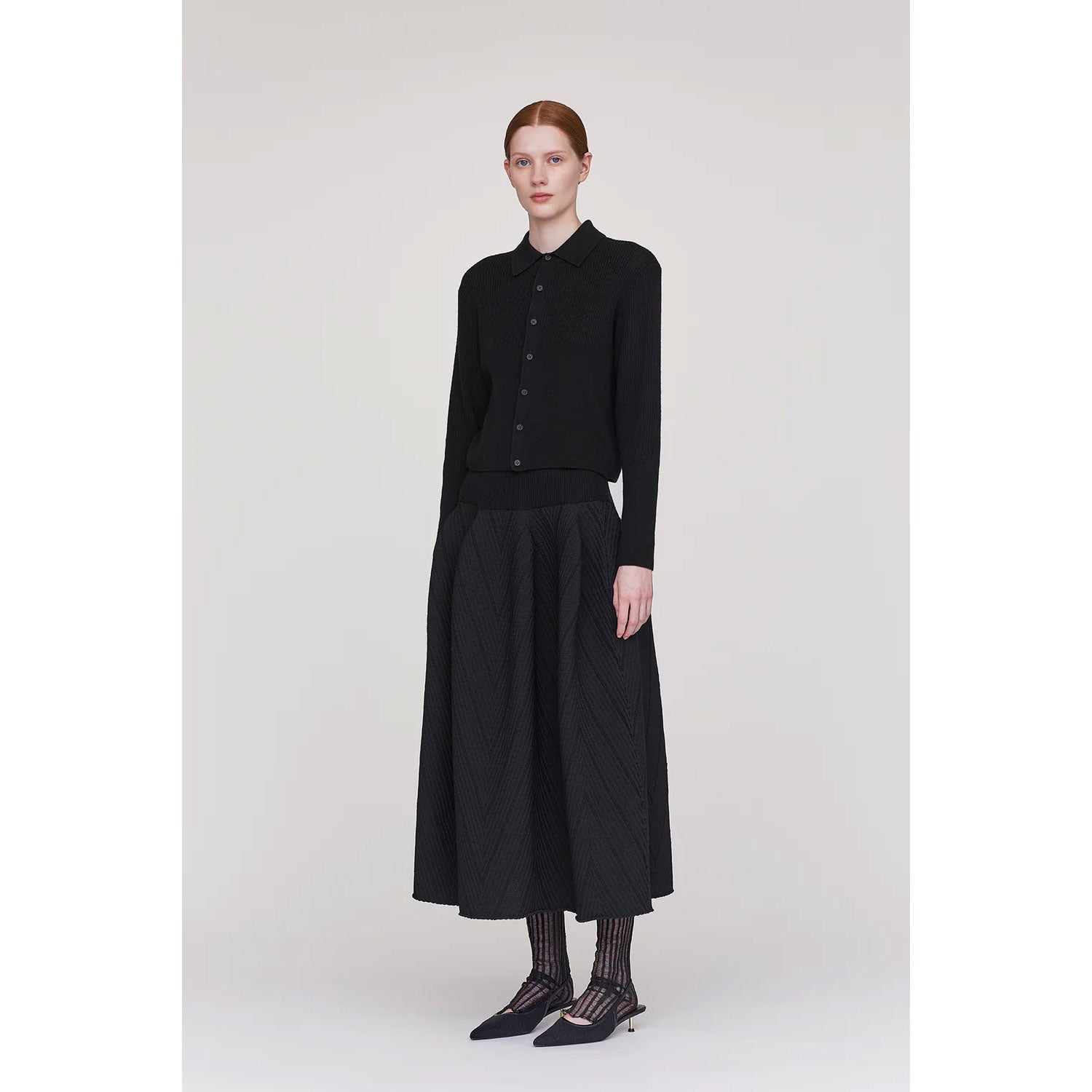 大胆なヘリンボーン柄のスカート。タイトにフィットするウエストに、コンピュータープログラミングによって作られたふんわりと広がる構築的なフォルムが印象的です。縫代がなく、快適な着心地です。