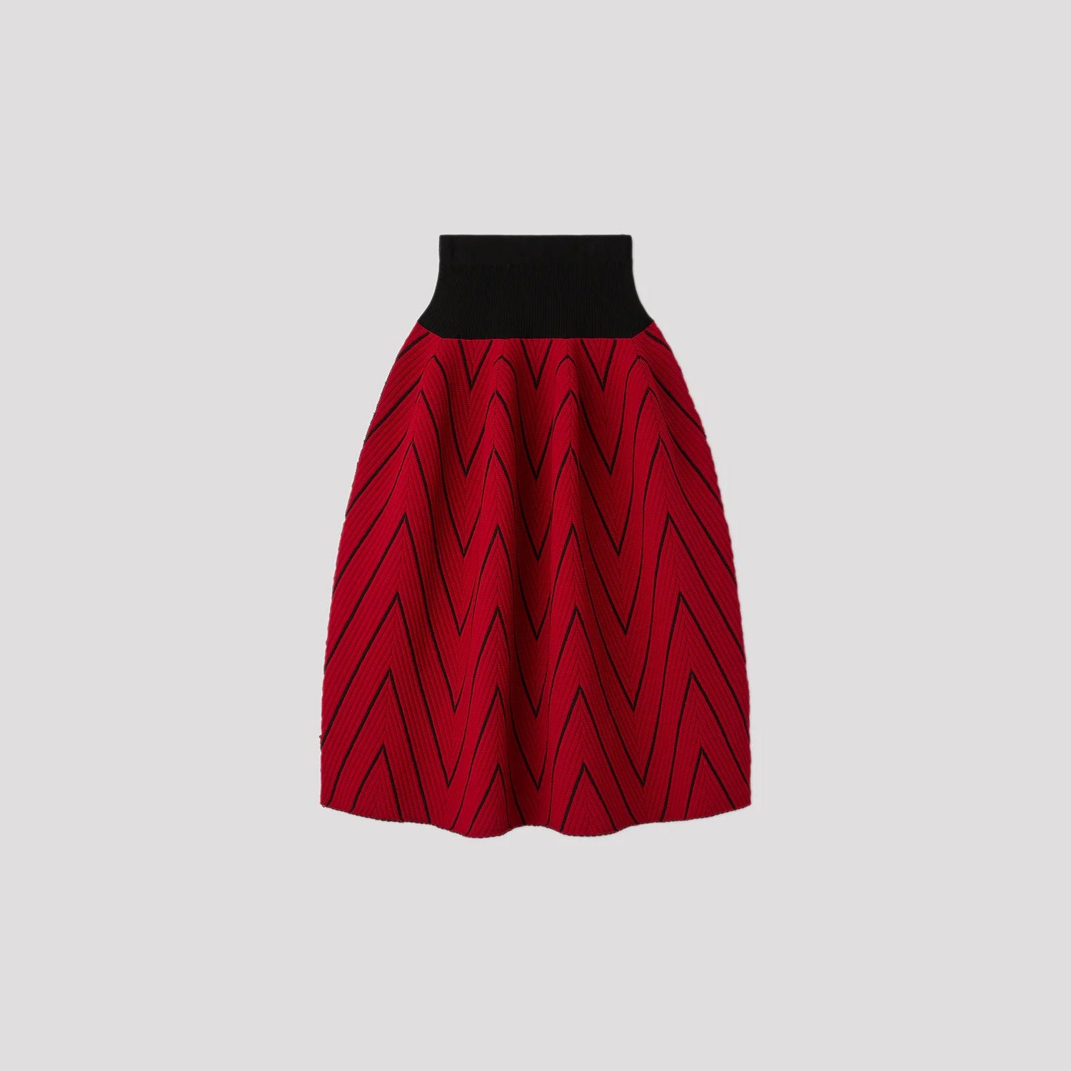 大胆なヘリンボーン柄のスカート。タイトにフィットするウエストに、コンピュータープログラミングによって作られたふんわりと広がる構築的なフォルムが印象的です。縫代がなく、快適な着心地です。