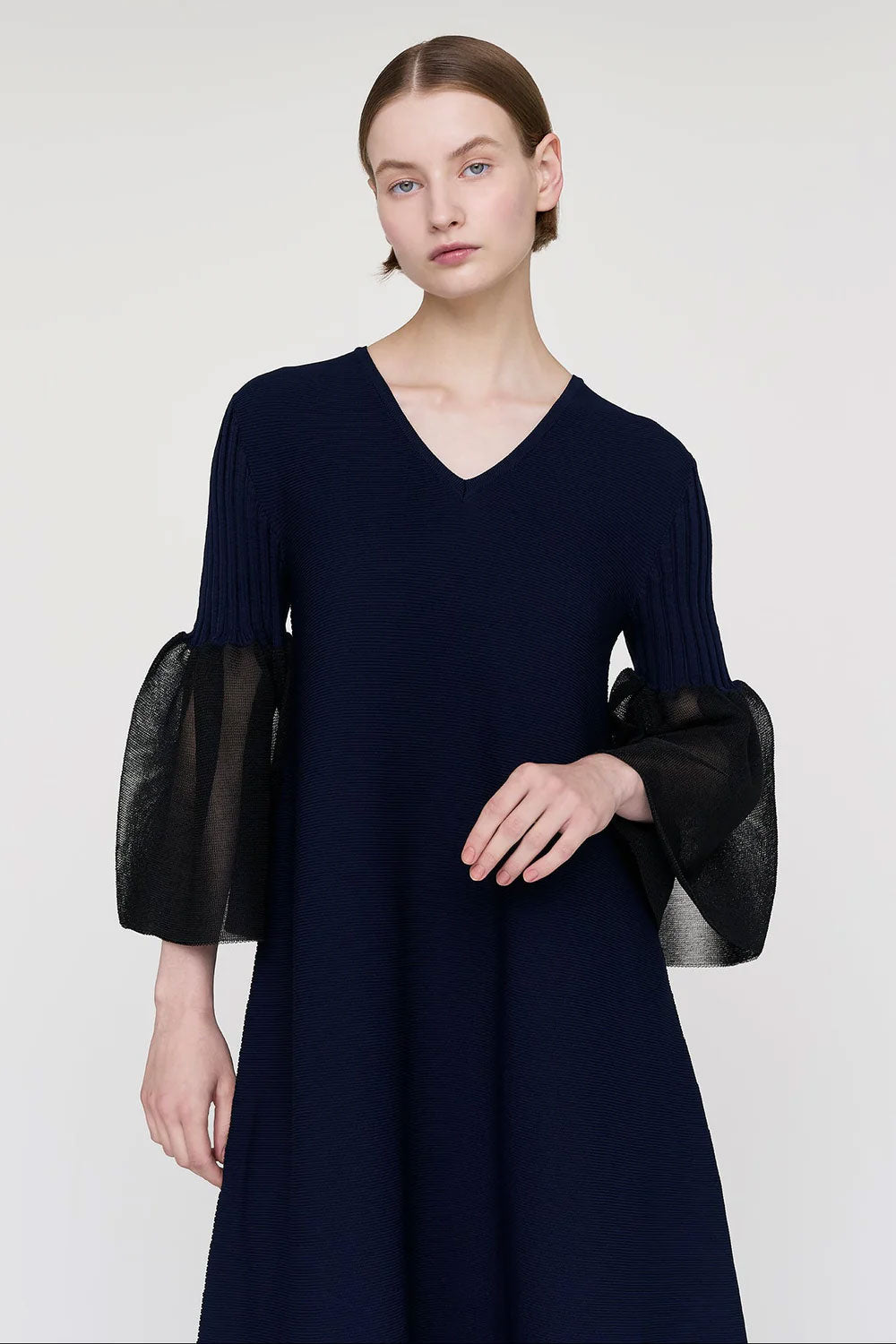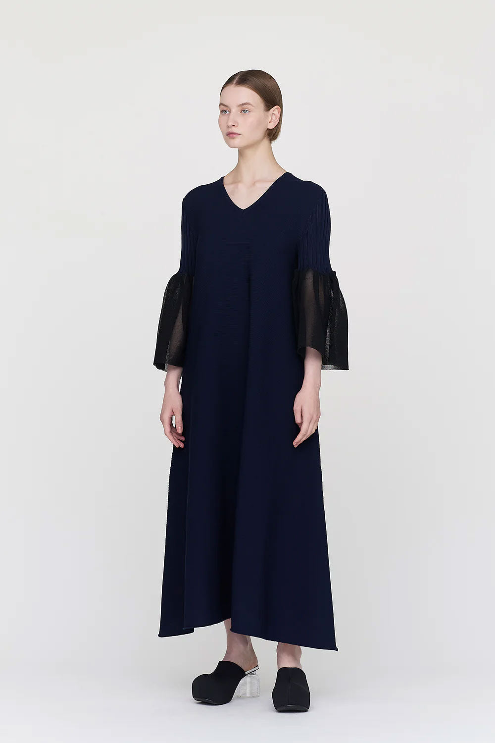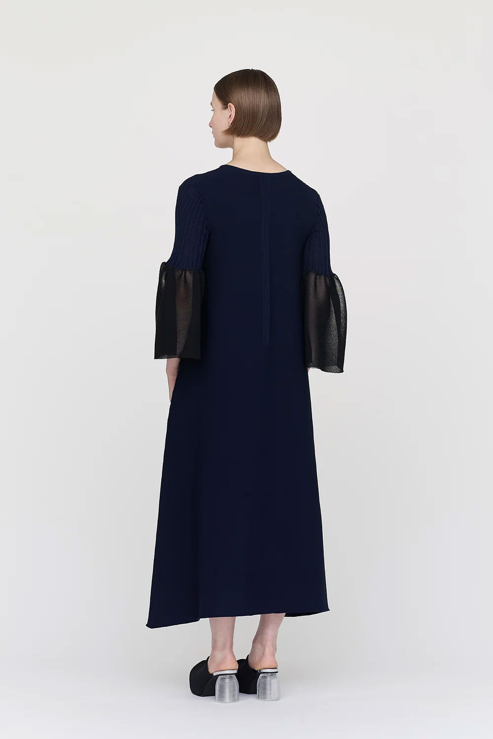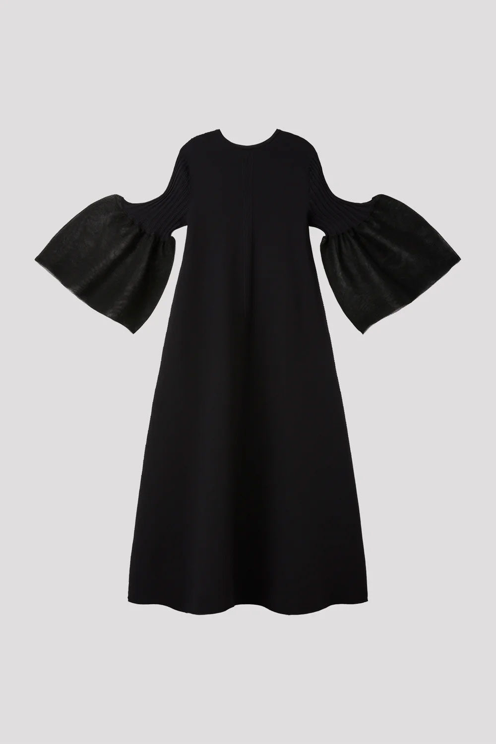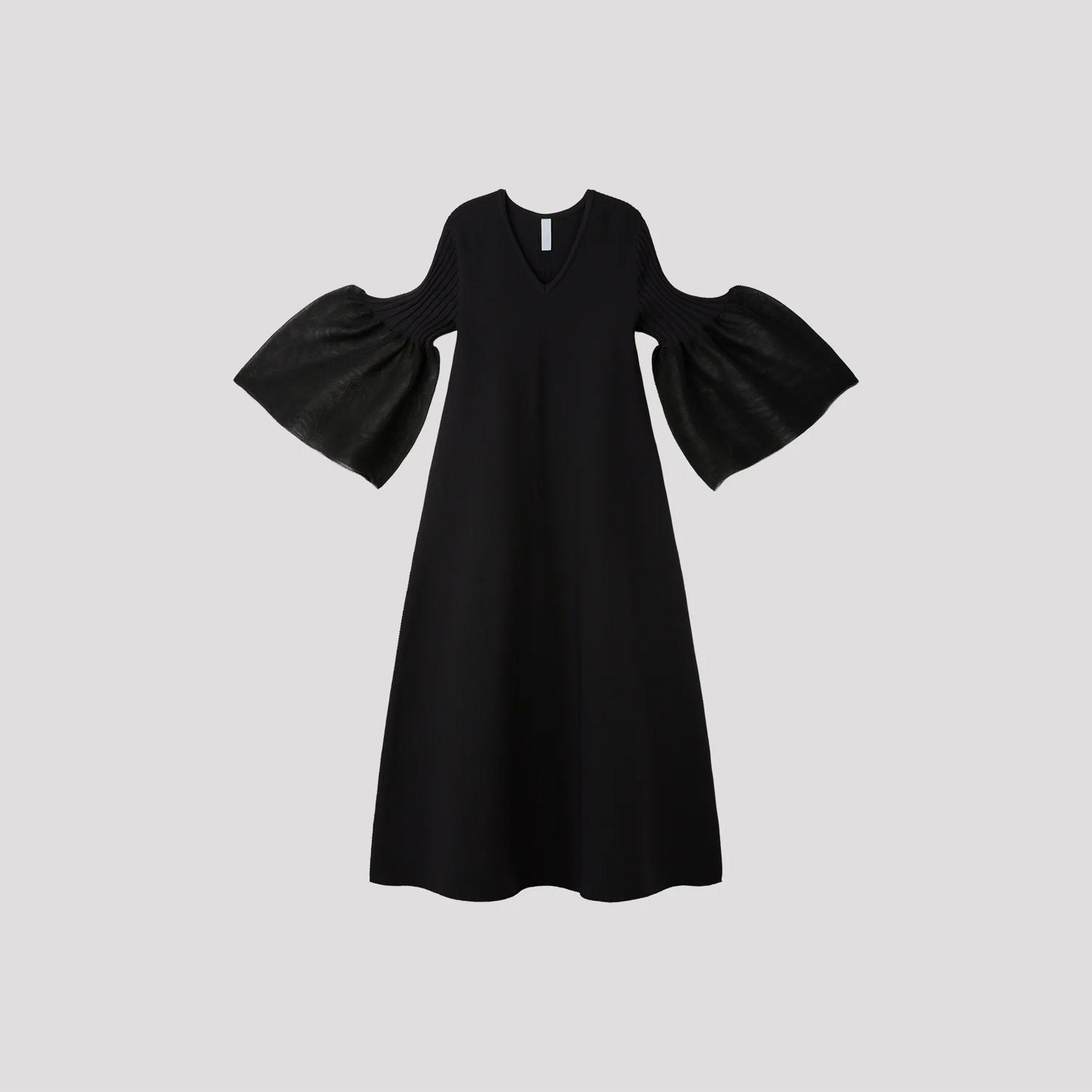CFCLを象徴するPOTTERYシリーズのベルスリーブフレアドレス。コンピュータープログラミングによって作られた立体感のあるベルスリーブが特徴で、あらゆるオケージョンに対応できるデザインです。袖口には透明感のある糸を使用し、軽やかさを演出しています。縫代がなく、ストレッチ性に優れ、快適な着心地です。