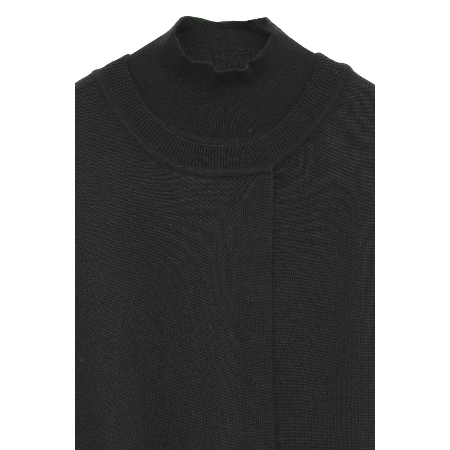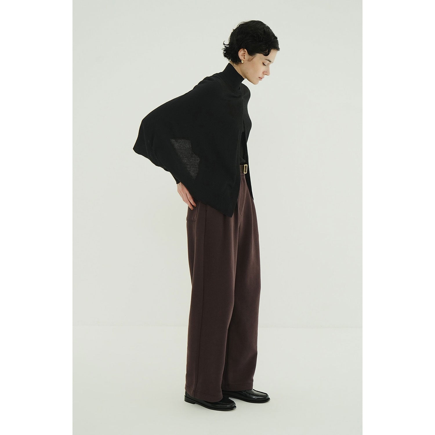 ケープはあえてアシンメトリーなデザインにすることで、肩から自然に羽織ったり、マフラーのように首に巻いたりと、幅広いスタイリングが楽しめます。インナーのハイネックロングスリーブは、シンプルでコンパクトなデザインに仕上げており、単体でも活躍する万能な一枚です。
