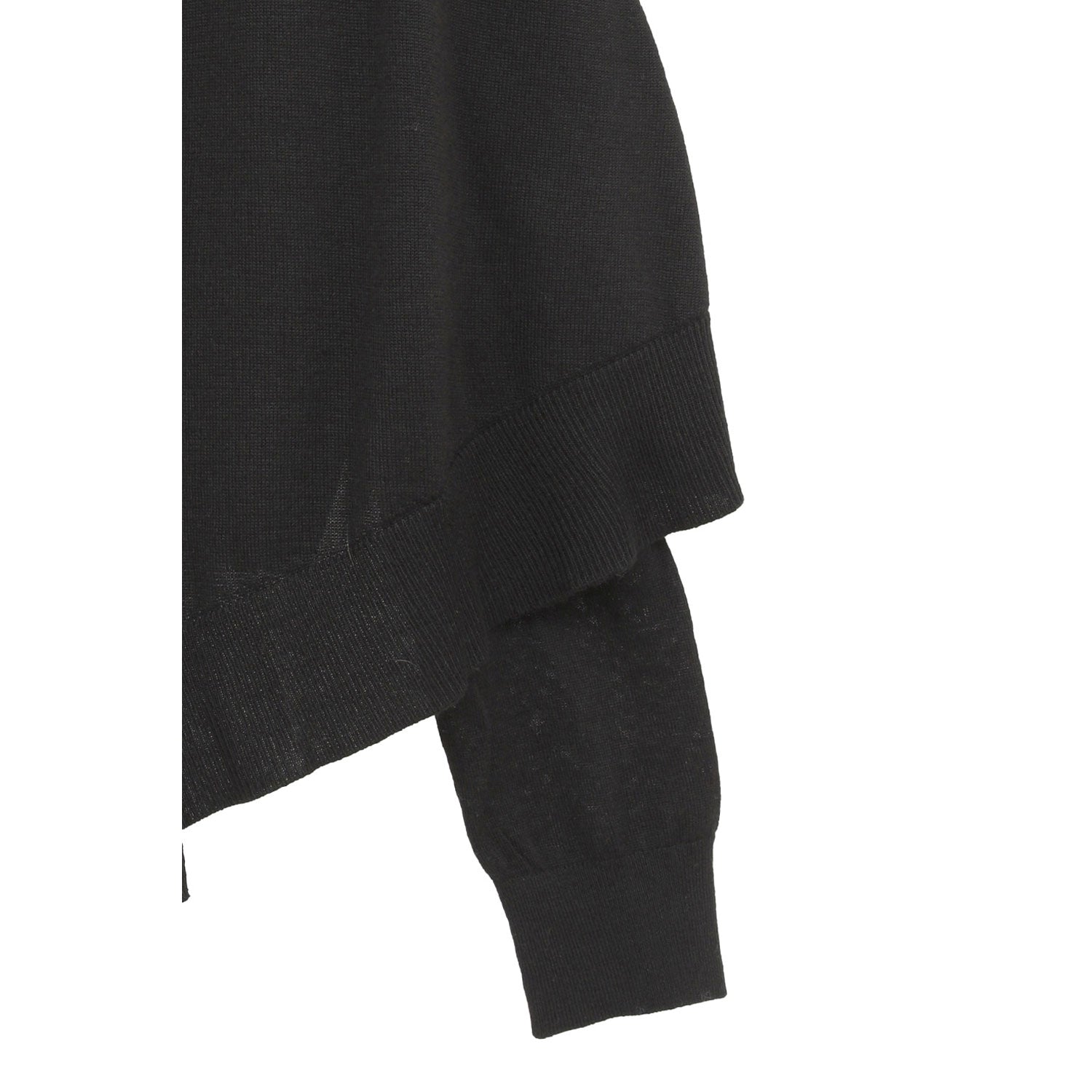 ケープはあえてアシンメトリーなデザインにすることで、肩から自然に羽織ったり、マフラーのように首に巻いたりと、幅広いスタイリングが楽しめます。インナーのハイネックロングスリーブは、シンプルでコンパクトなデザインに仕上げており、単体でも活躍する万能な一枚です。