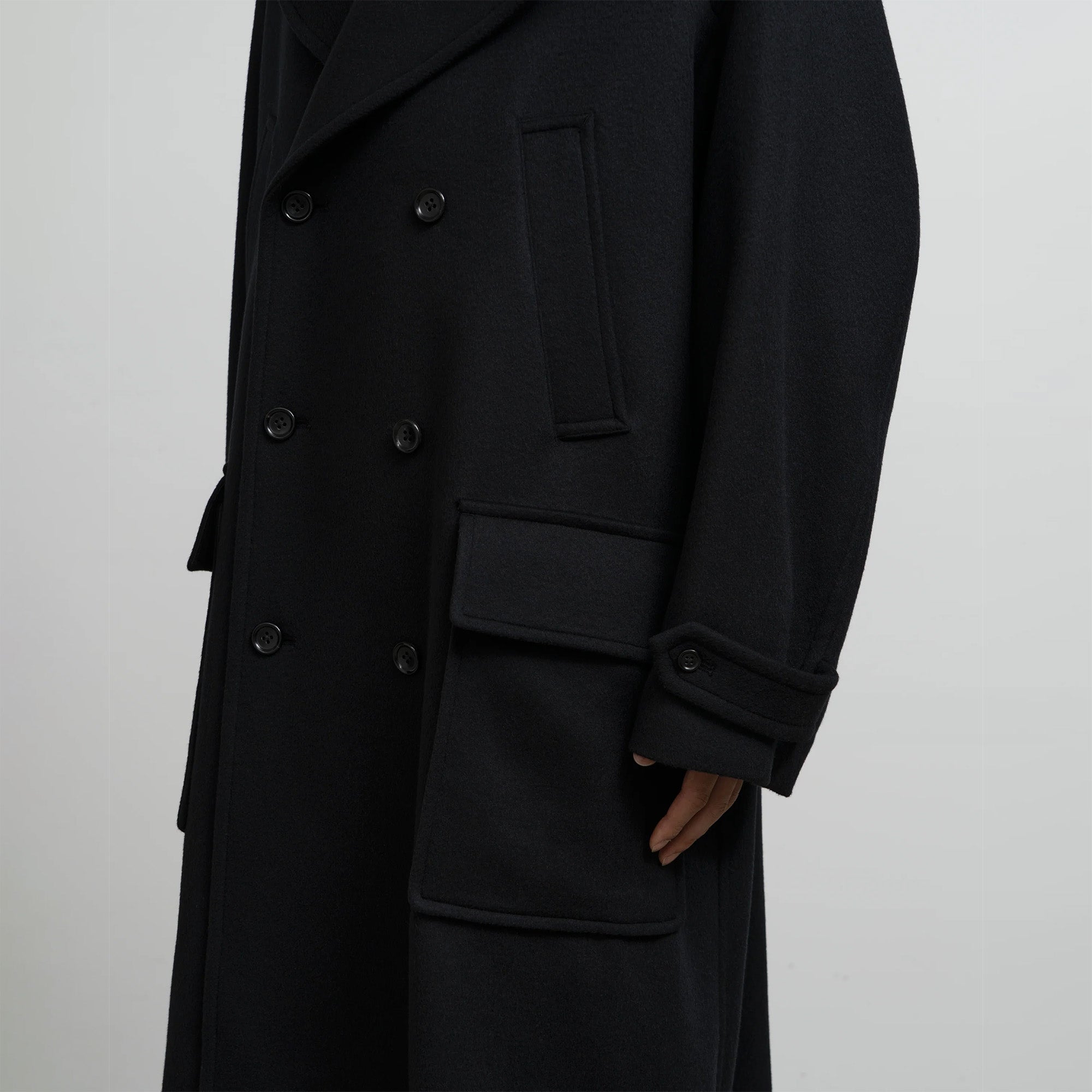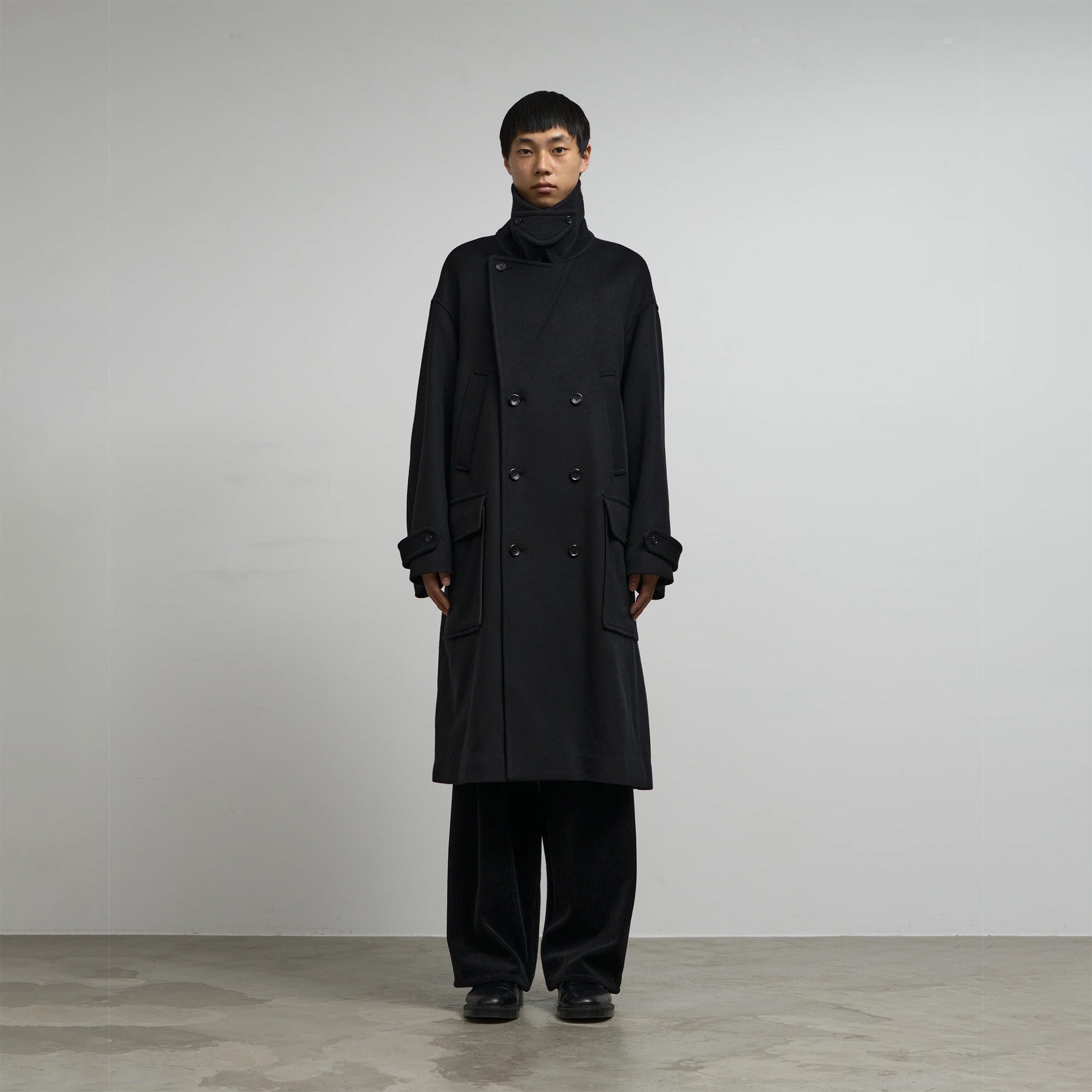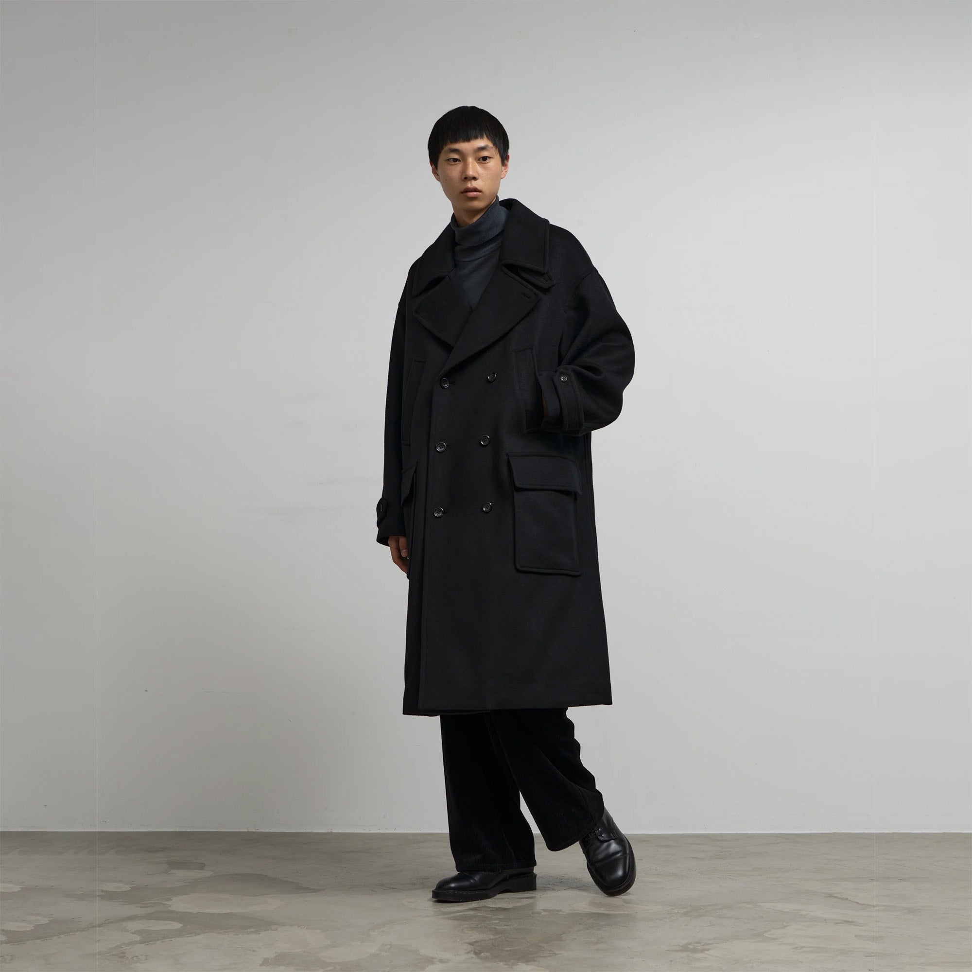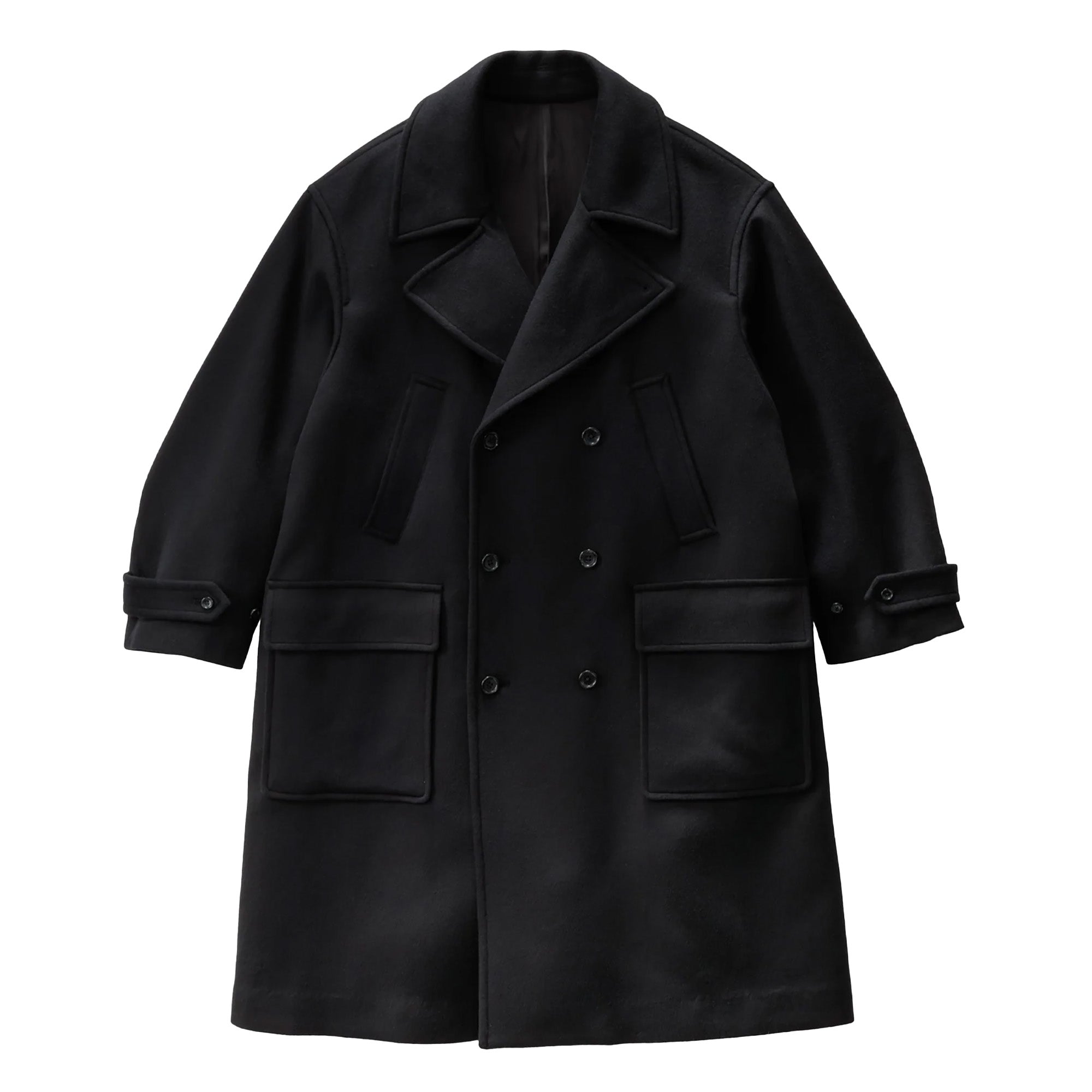 SUPER140’s原料を混紡したダブルメルトンのショールカラーコート。原料由来の上質な風合いに加え、中糸に水溶性糸を取り入れることで軽さとふくらみを実現。暖かな空気をしっかり閉じ込めます。ショートビーバー仕上げによるフラットな表情と自然な膨らみが、快適な着心地と上質な佇まいを生み出す一着です。