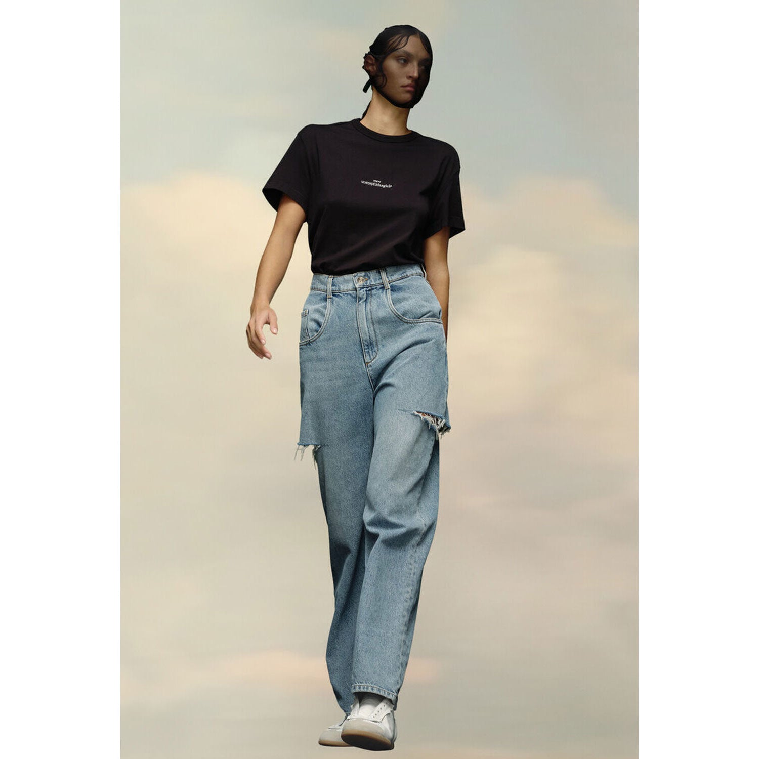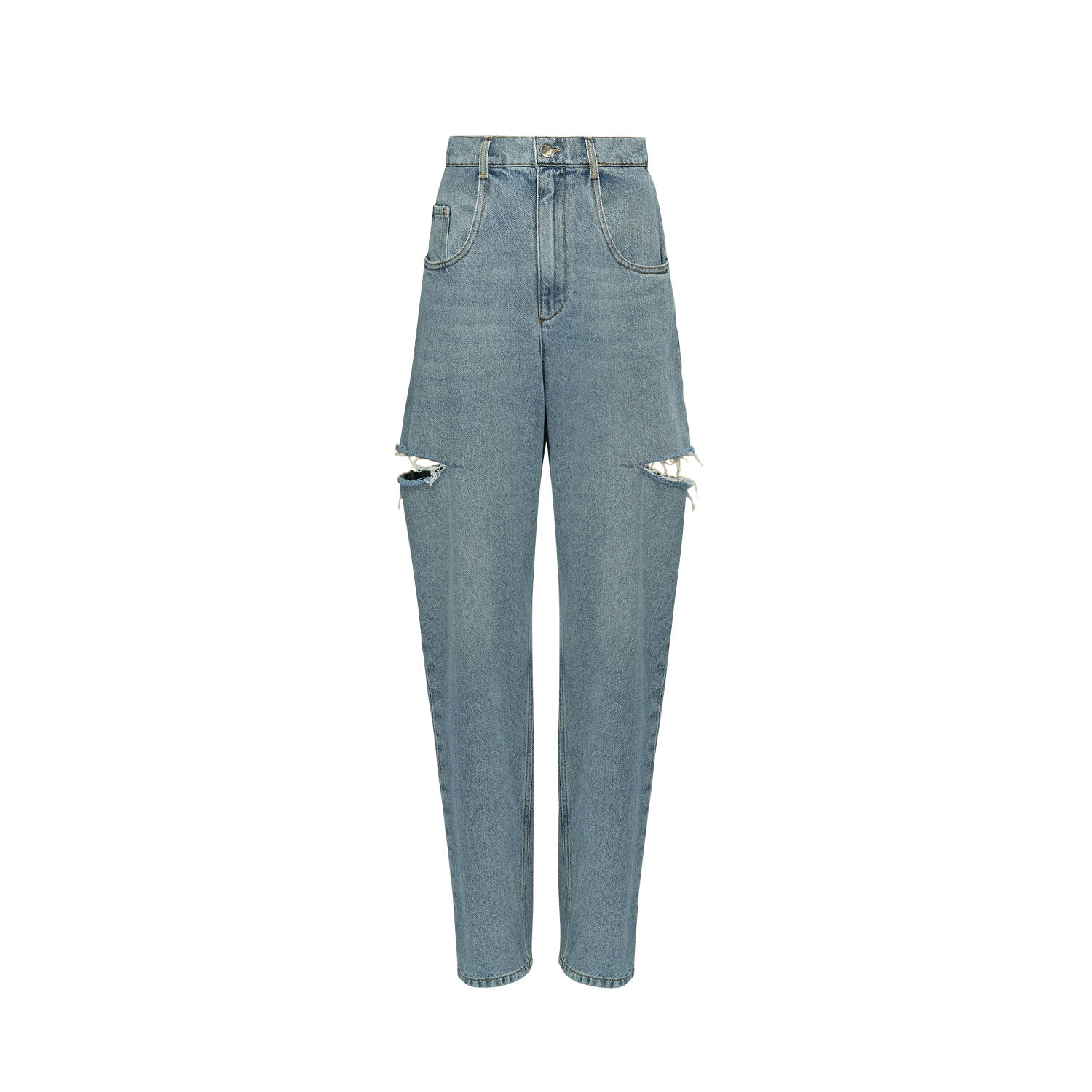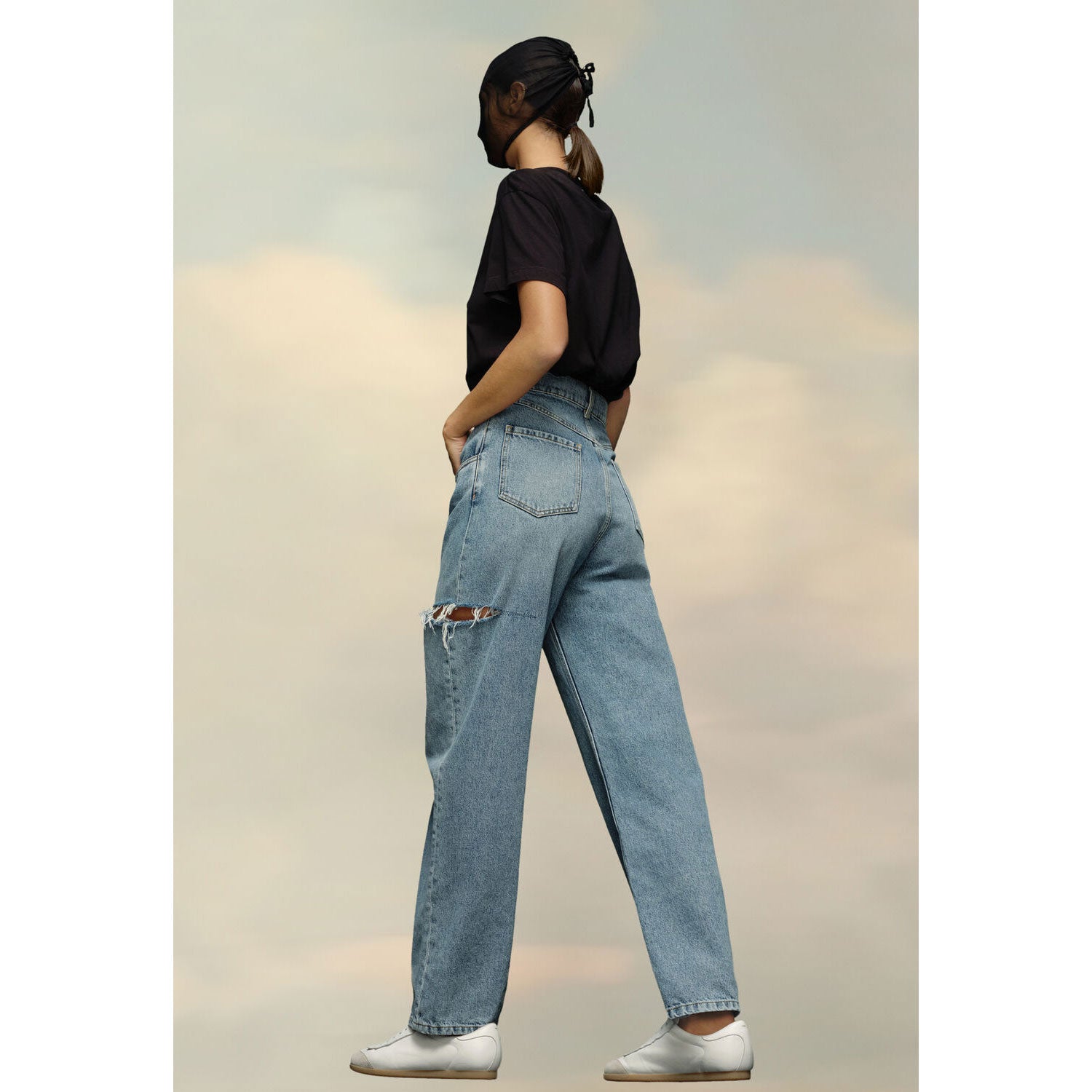 ストーンウォッシュの色合いのルーズフィットのデニムジーンズです。ウエストはタイトで、ストレートのレッグはボリュームがあります。レッグはラフなカットで、太腿のスラッシュ部分からほつれた布が見えます。5ポケットのコットン製ジーンズで、コントラストを生み出すキャメルカラーのトップステッチが施されています。