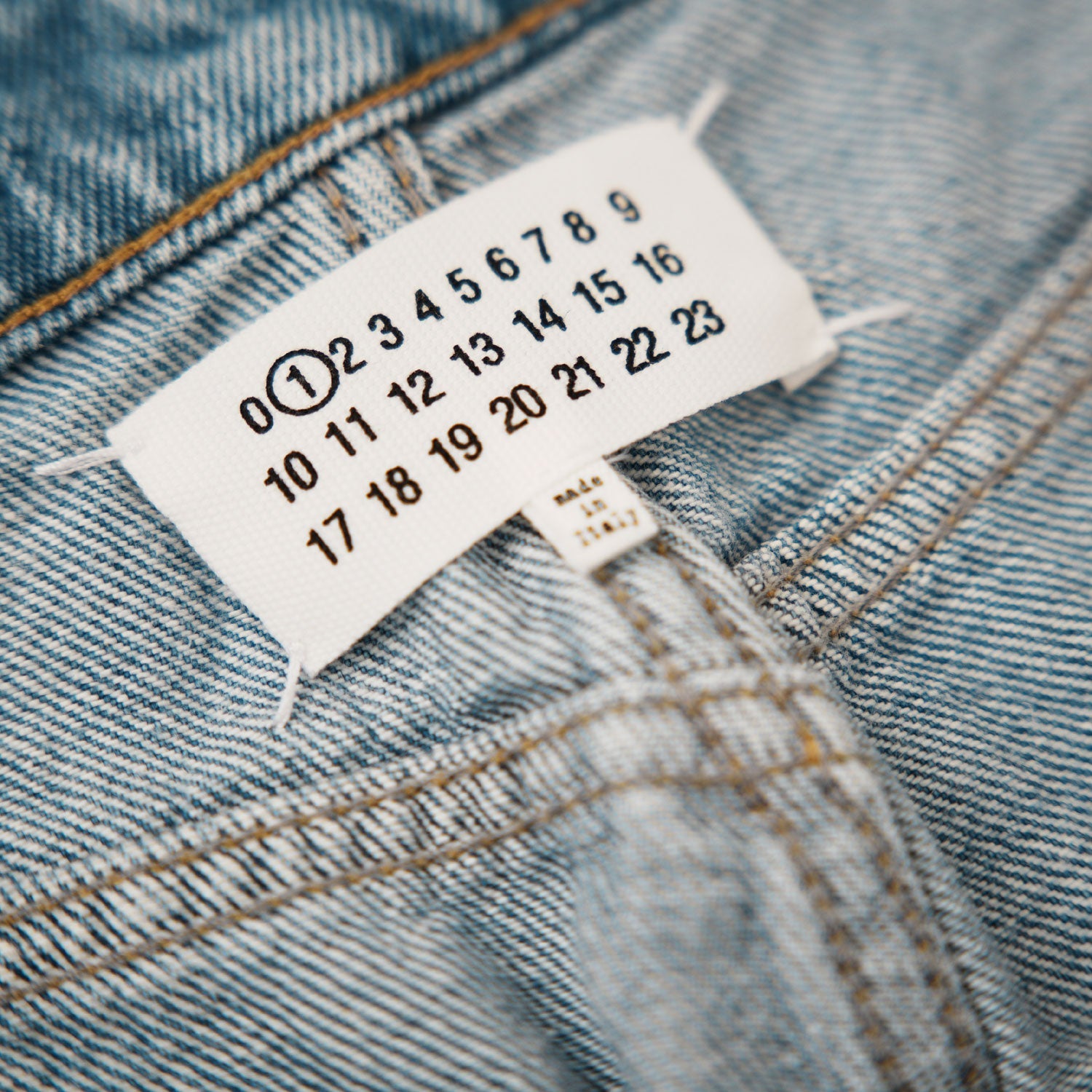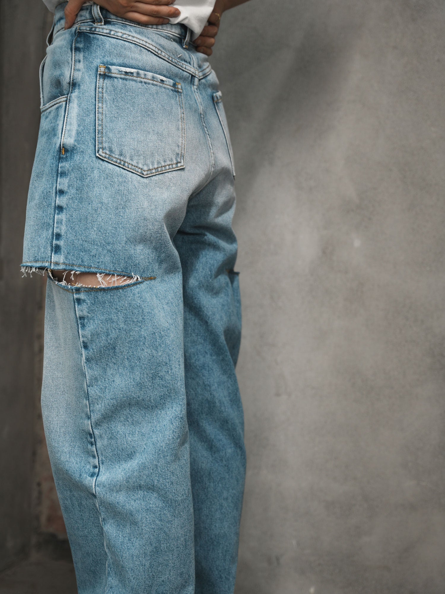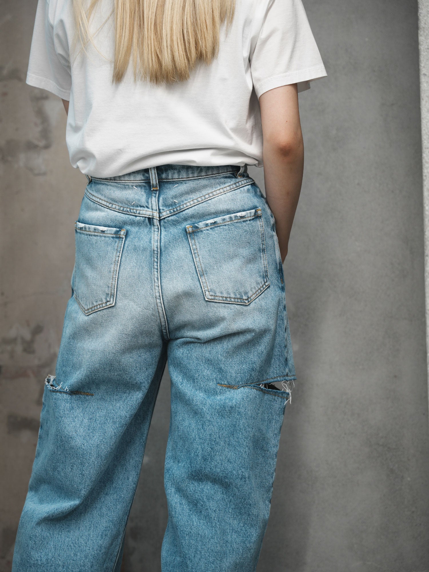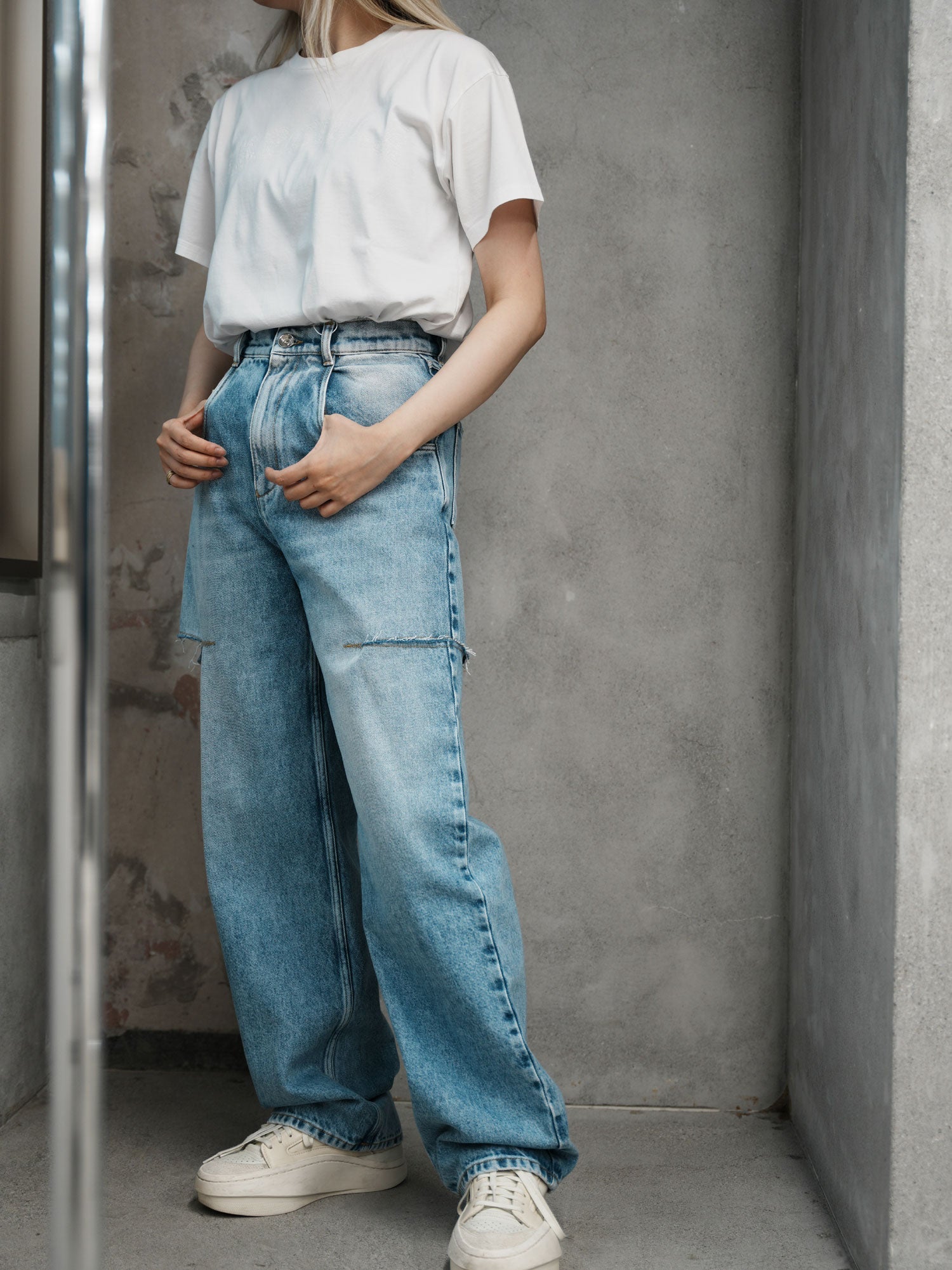 ストーンウォッシュの色合いのルーズフィットのデニムジーンズです。ウエストはタイトで、ストレートのレッグはボリュームがあります。レッグはラフなカットで、太腿のスラッシュ部分からほつれた布が見えます。5ポケットのコットン製ジーンズで、コントラストを生み出すキャメルカラーのトップステッチが施されています。