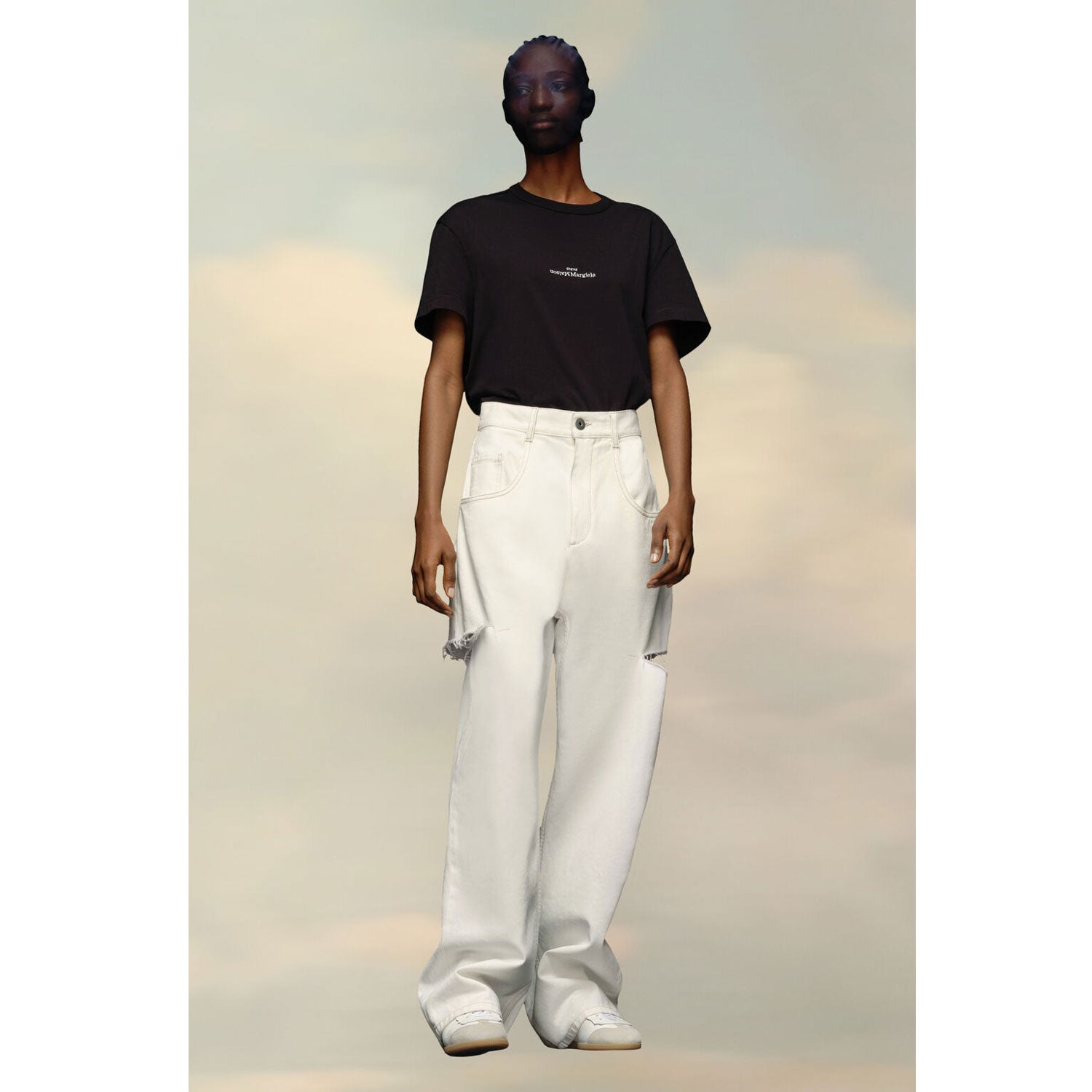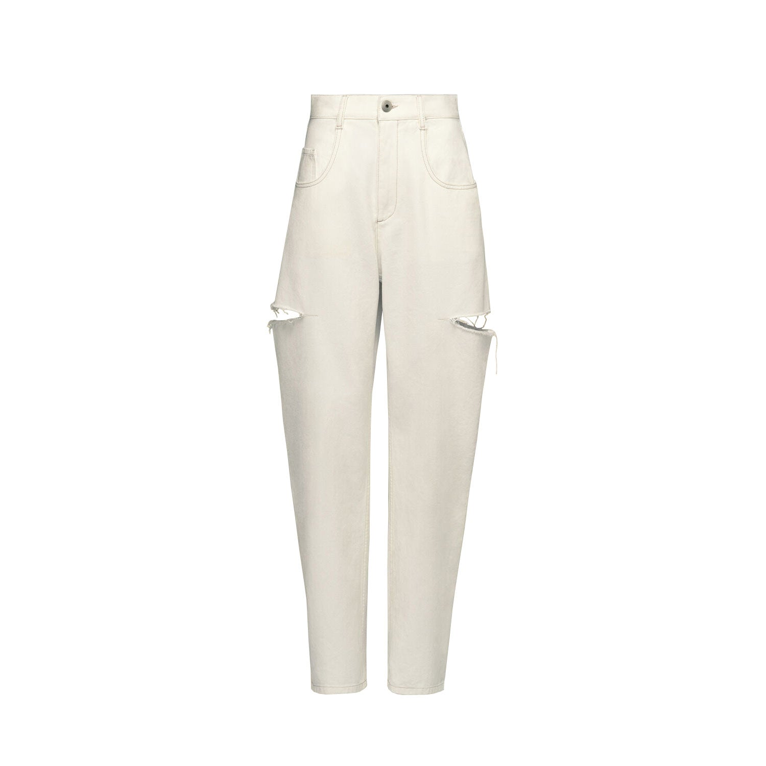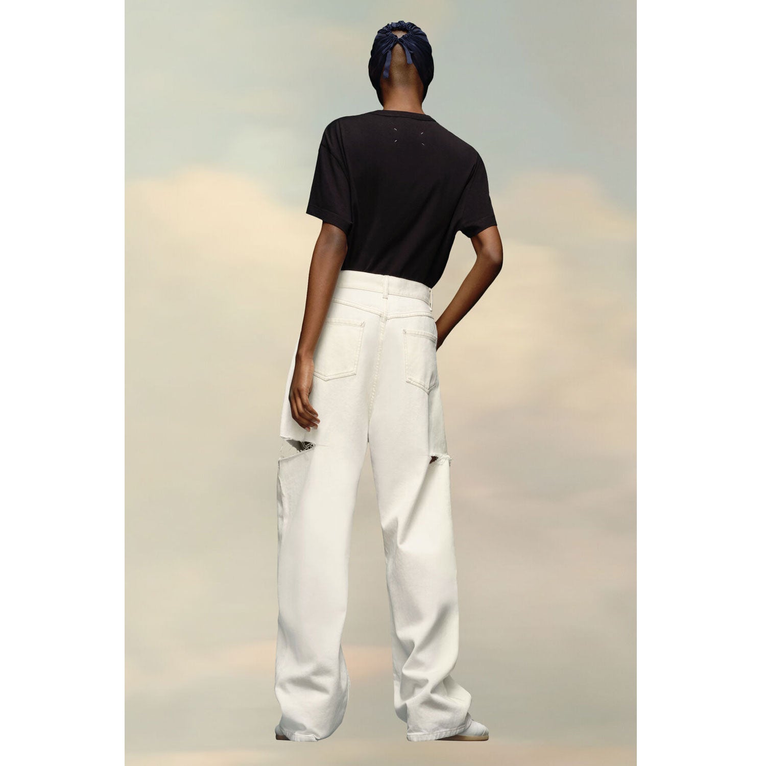 ウエストはタイトで、ストレートのレッグはボリュームがあります。レッグはラフなカットで、太腿のスラッシュ部分からほつれた布が見えます。
