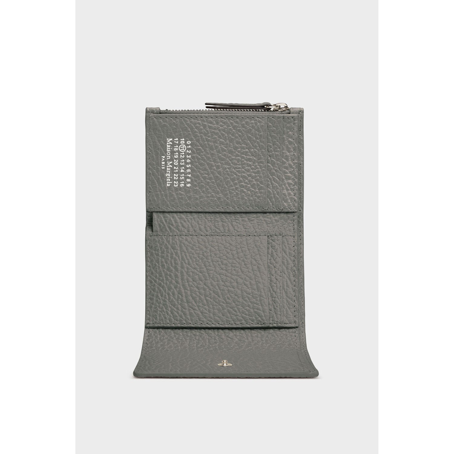 エンボス加工が施されたグレイニーレザー製の三つ折り ウォレットです。内側には4つのカードホルダーとファスナー付きのセクションが備わっており、ナンバリングロゴが配されています。バックには、通常のファッションブランドのラベルとは対照的なメゾン マルジェラのシグネチャーの白い4ステッチがあしらわれています。
