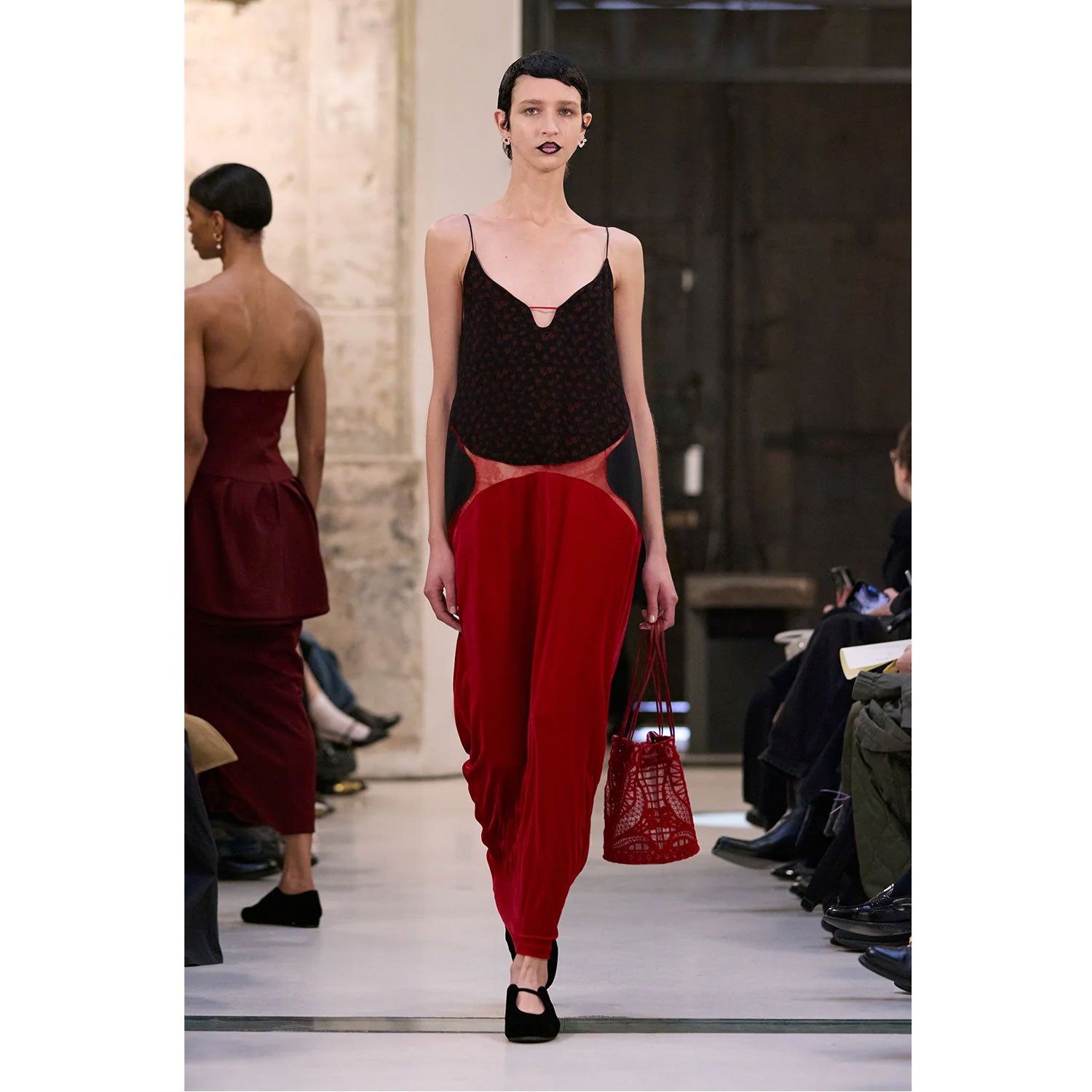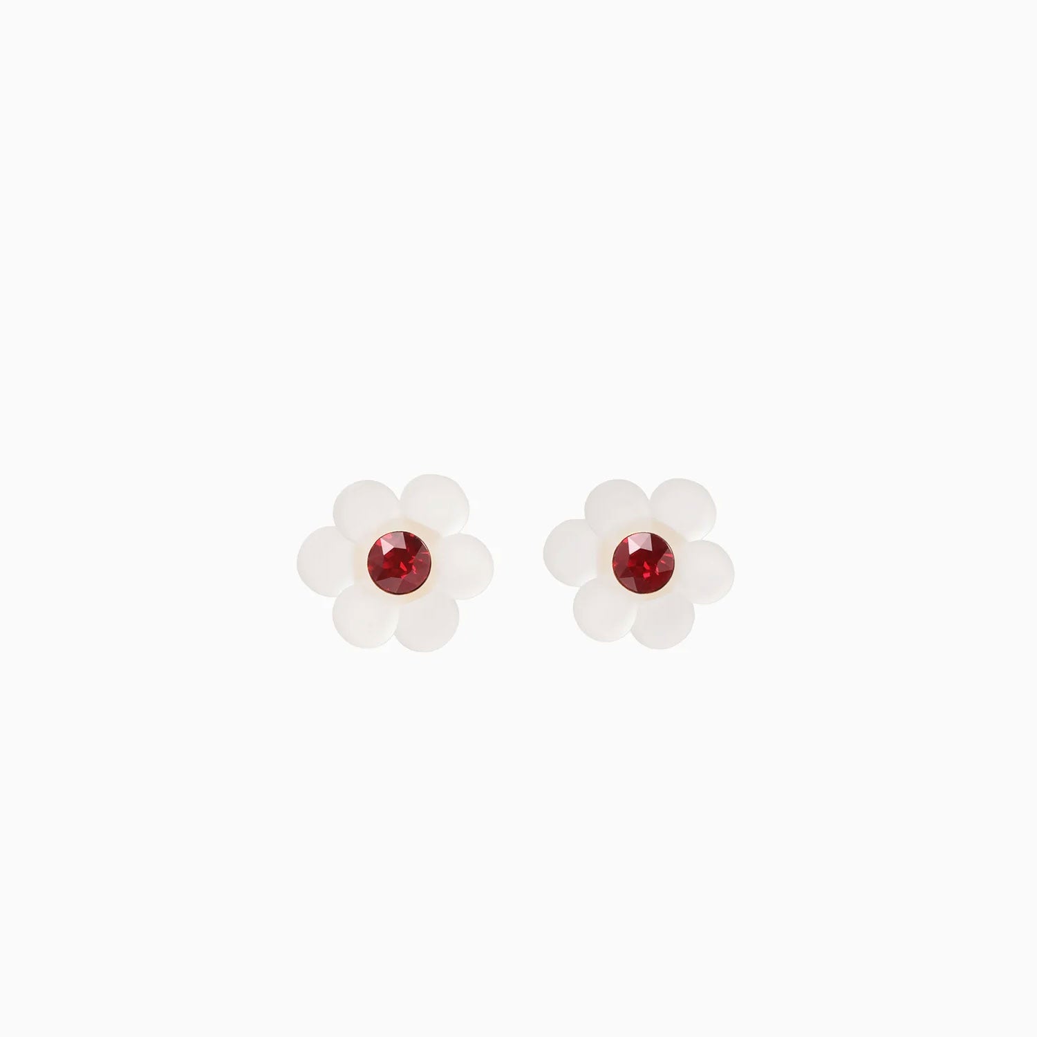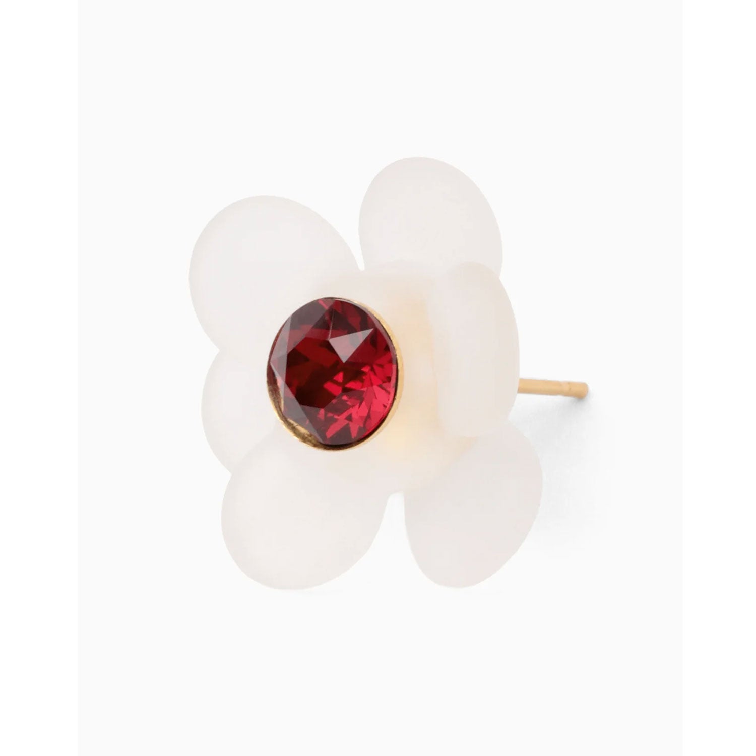 ガラスで形成された花びらと中央にあしらった赤いビジューの愛らしいデザインがいつもの装いに華やぎを与える。ガラスのモチーフは職⼈の⼿作業によって1点1点形成され、細かい砂を当て研磨するフロスト加工を施すことですりガラスのような儚げな印象に。キャッチには淡水パールを使用し、柔らかな光沢が上品な印象を与える1点。