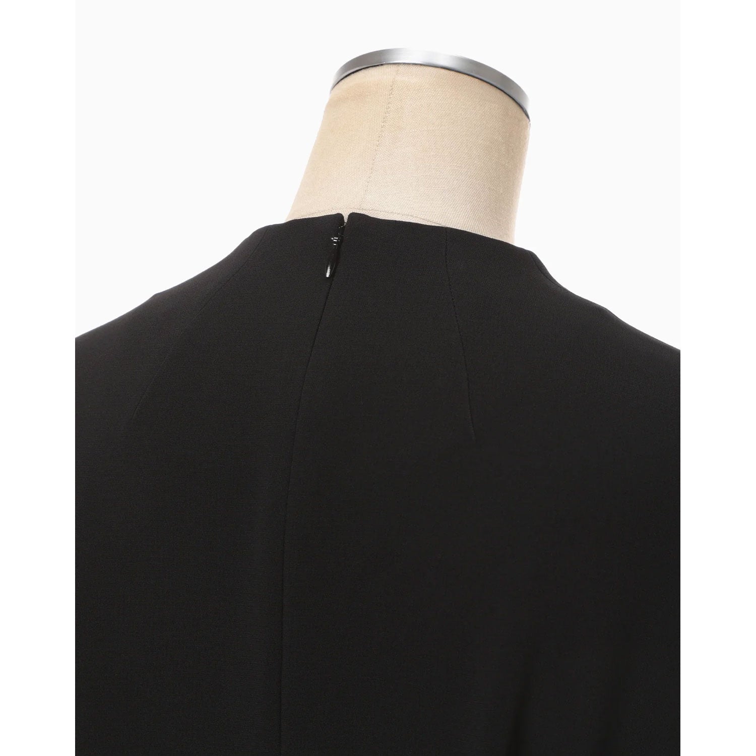 トリアセテートの中でも膨らみのある糸を使用し、ポリエステルを混合することで、ストレッチ性のある生地が扱いやすく、発色性の良さを獲得しながらシワにもなりにくい素材がイージーケアを叶える。高めの位置でウエストをマークすることで、縦のラインを強調し、スタイルアップを叶える。袖のレースカフスは手元の所作を美しく魅せ、着用シーンに合わせて取り外しが可能に。1着で様々なオケージョンに対応することが可能。