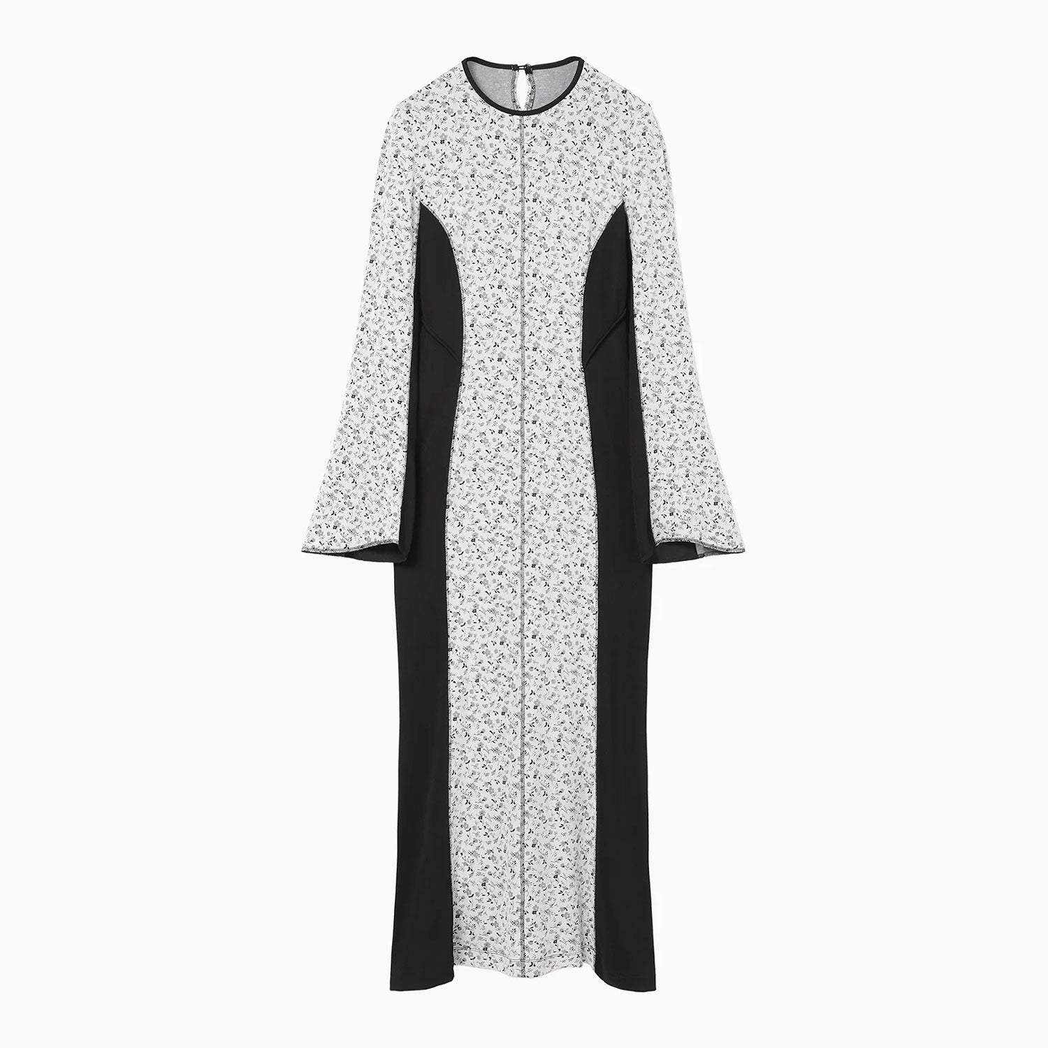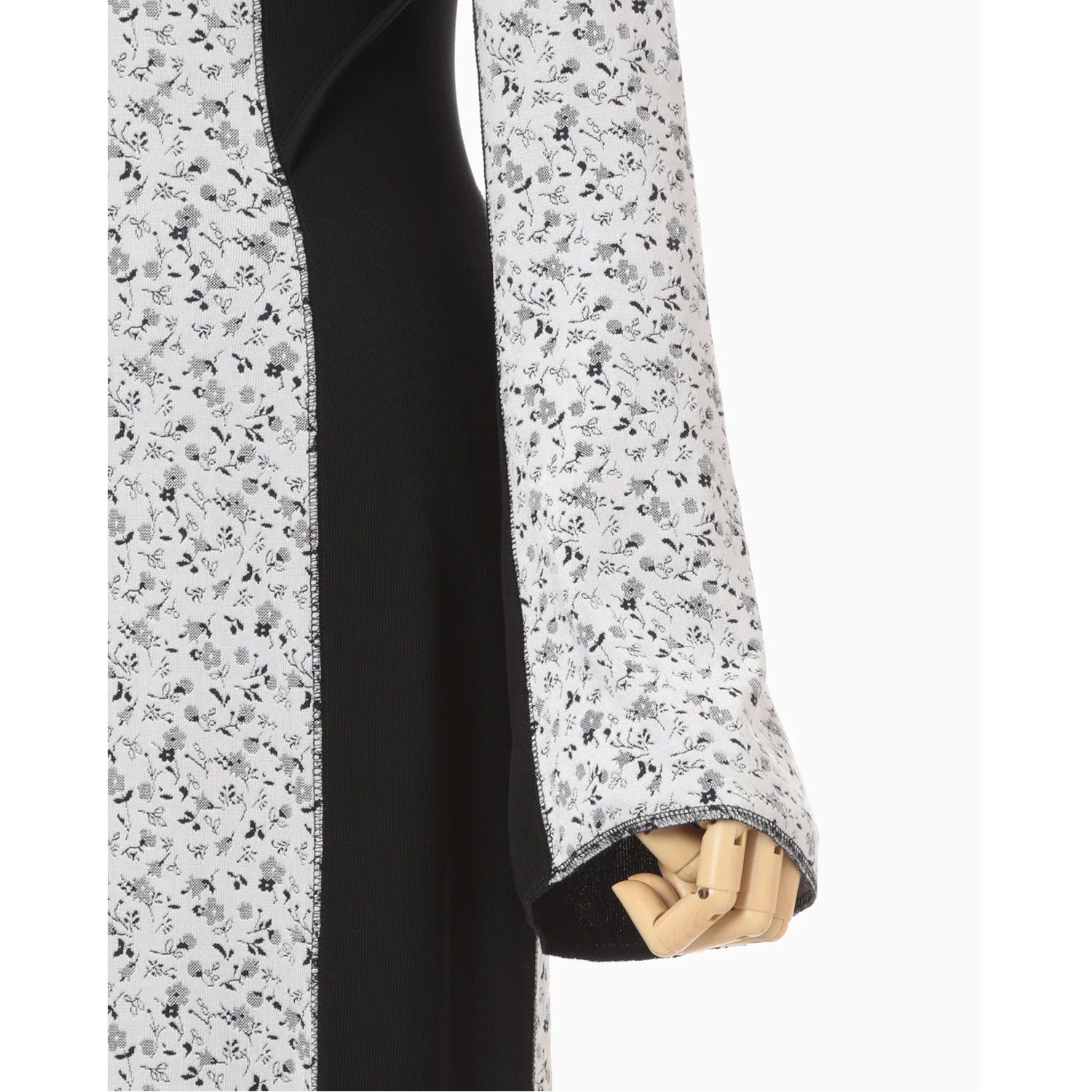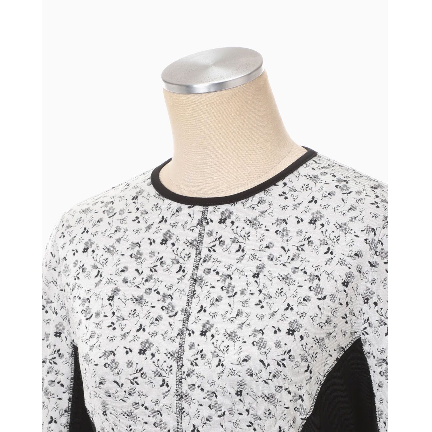 レーヨンをベースにナイロンポリウレタンの糸で小花柄を表現することで、柄の部分に収縮が生まれ凹凸を出すことで立体的な奥行きのある表情に。しなやかなジャージー素材が心地よく身体に寄り添い、大胆に開いた背中の開きとフィットアンドフレアのシルエットがセンシュアルな印象を与え、デイリーに着用しやすく、汎用性のある1着。