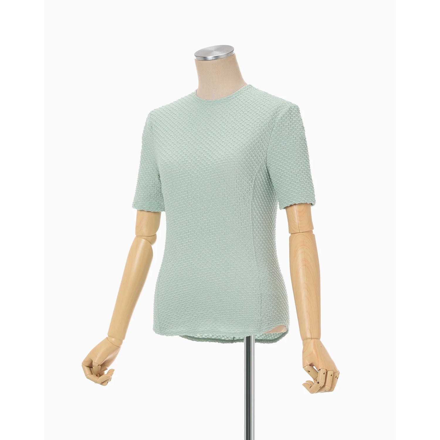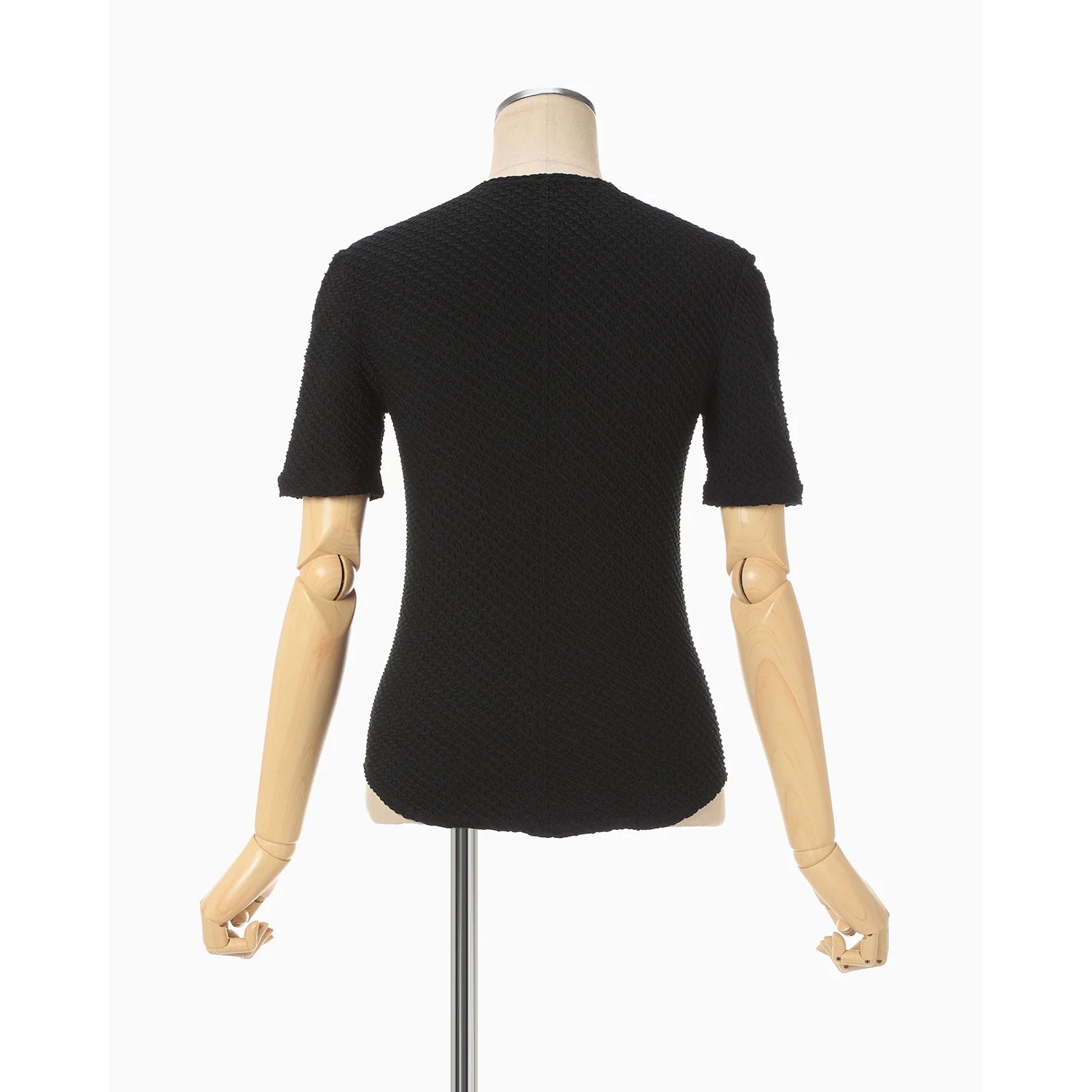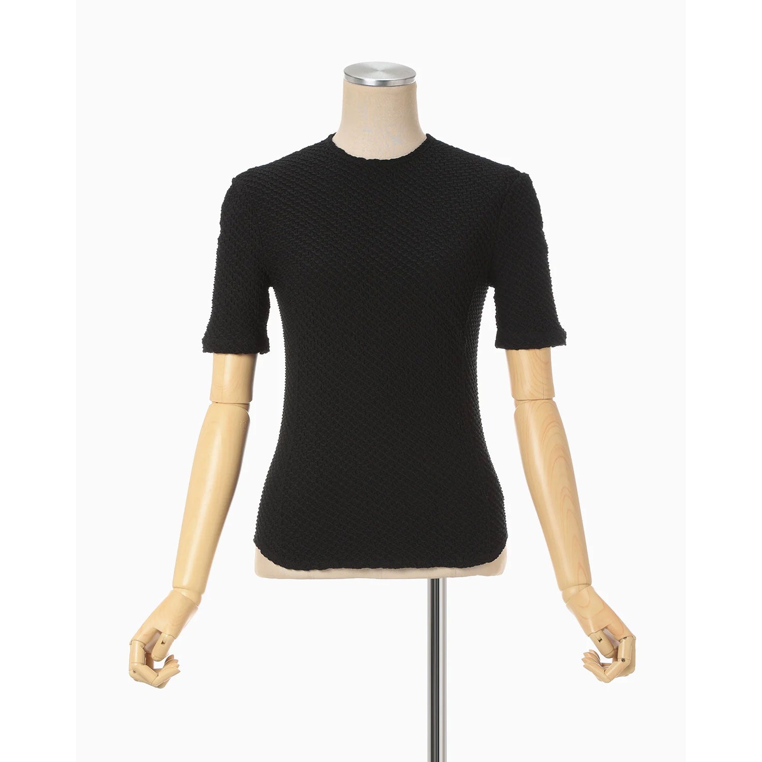 ポリウレタンをポリエステルでカバーリングした伸縮性のある糸で柄を編むことで、立体感のある表情に。コンパクトな身頃が特徴的なショートスリーブトップは、腕まわりに優しくフィットする袖のデザインが汎用性を高め、縫い代をステッチで抑えることによる、滑らかなフィッティングがカジュアルになりすぎない上品さを実現。1枚でトップスとしてもフィットするデザインはインナーとしても活躍する1着。