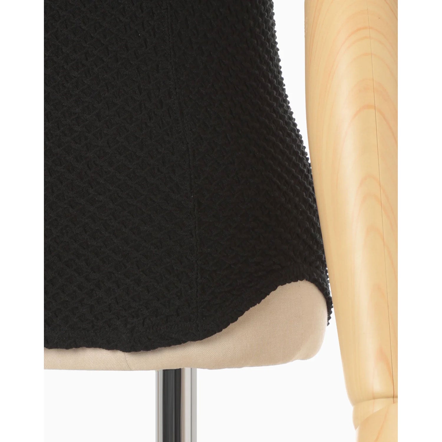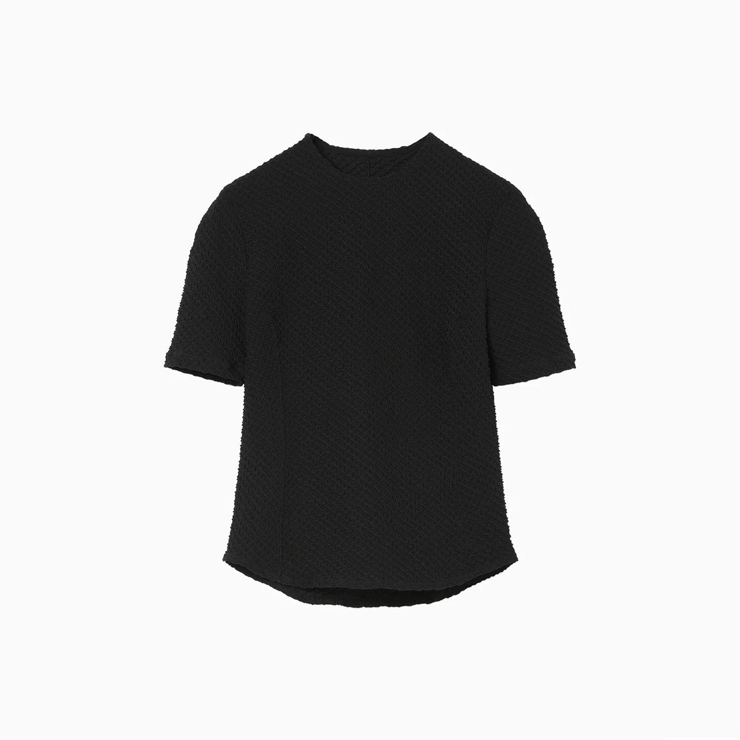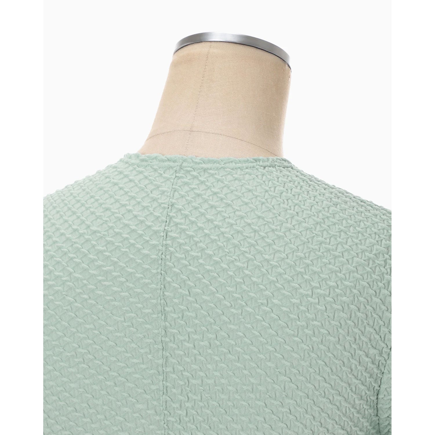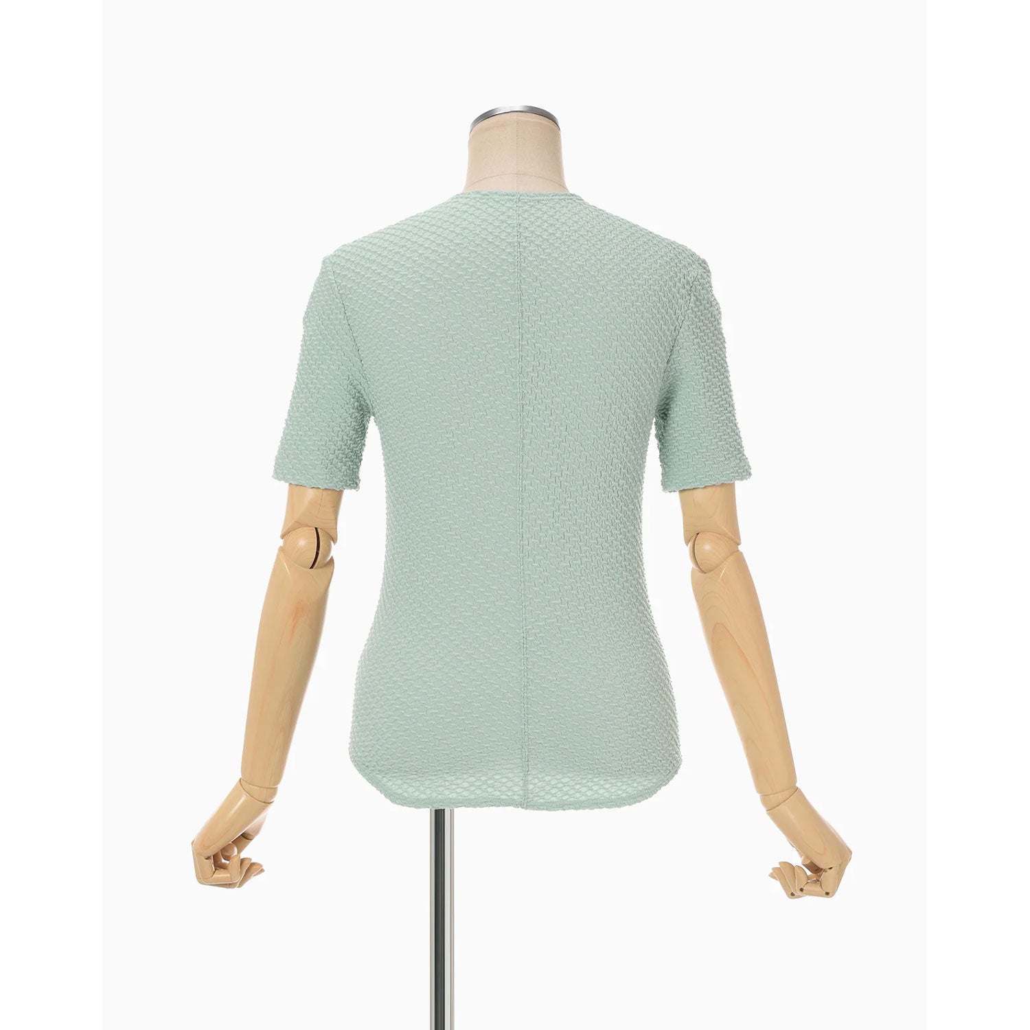 ポリウレタンをポリエステルでカバーリングした伸縮性のある糸で柄を編むことで、立体感のある表情に。コンパクトな身頃が特徴的なショートスリーブトップは、腕まわりに優しくフィットする袖のデザインが汎用性を高め、縫い代をステッチで抑えることによる、滑らかなフィッティングがカジュアルになりすぎない上品さを実現。1枚でトップスとしてもフィットするデザインはインナーとしても活躍する1着。