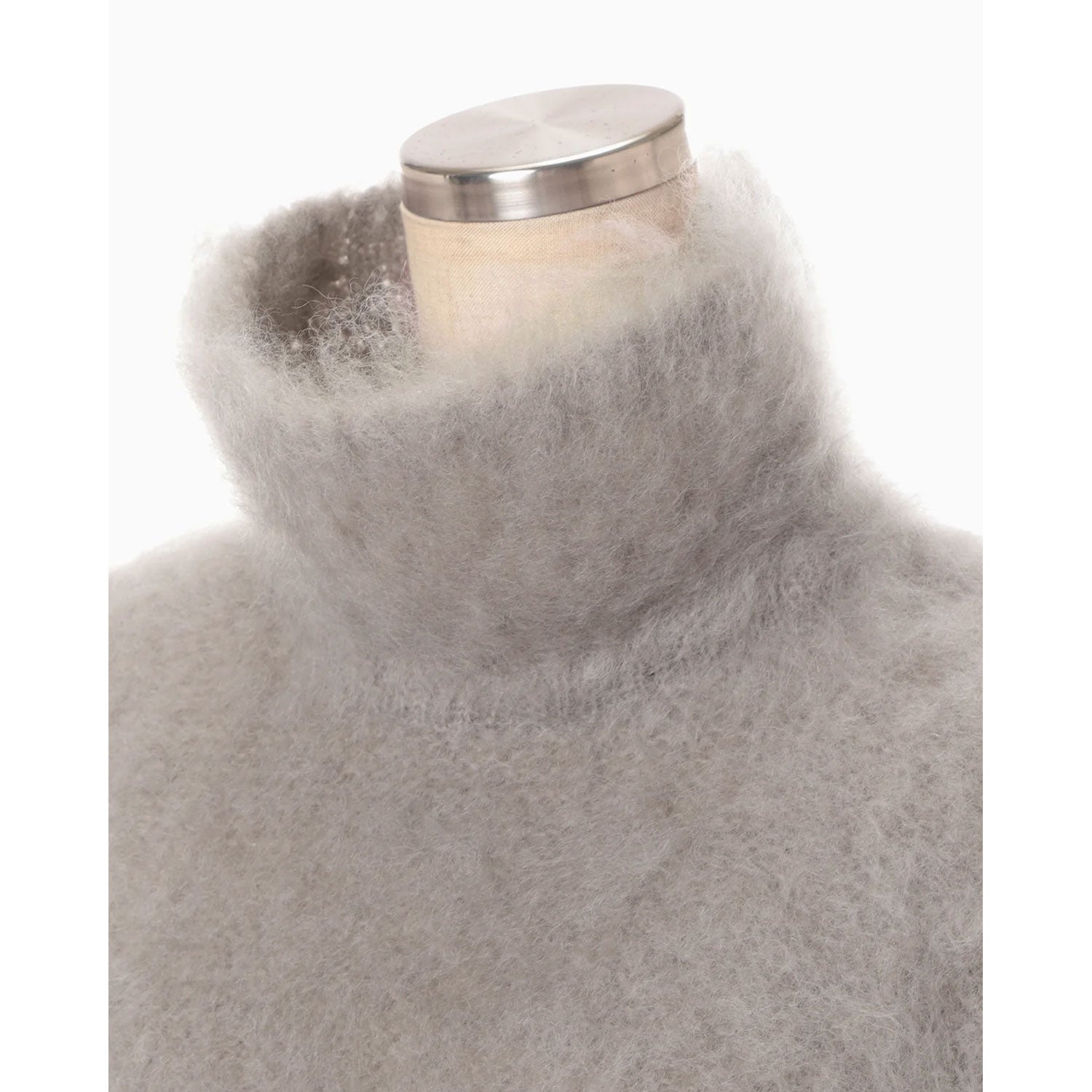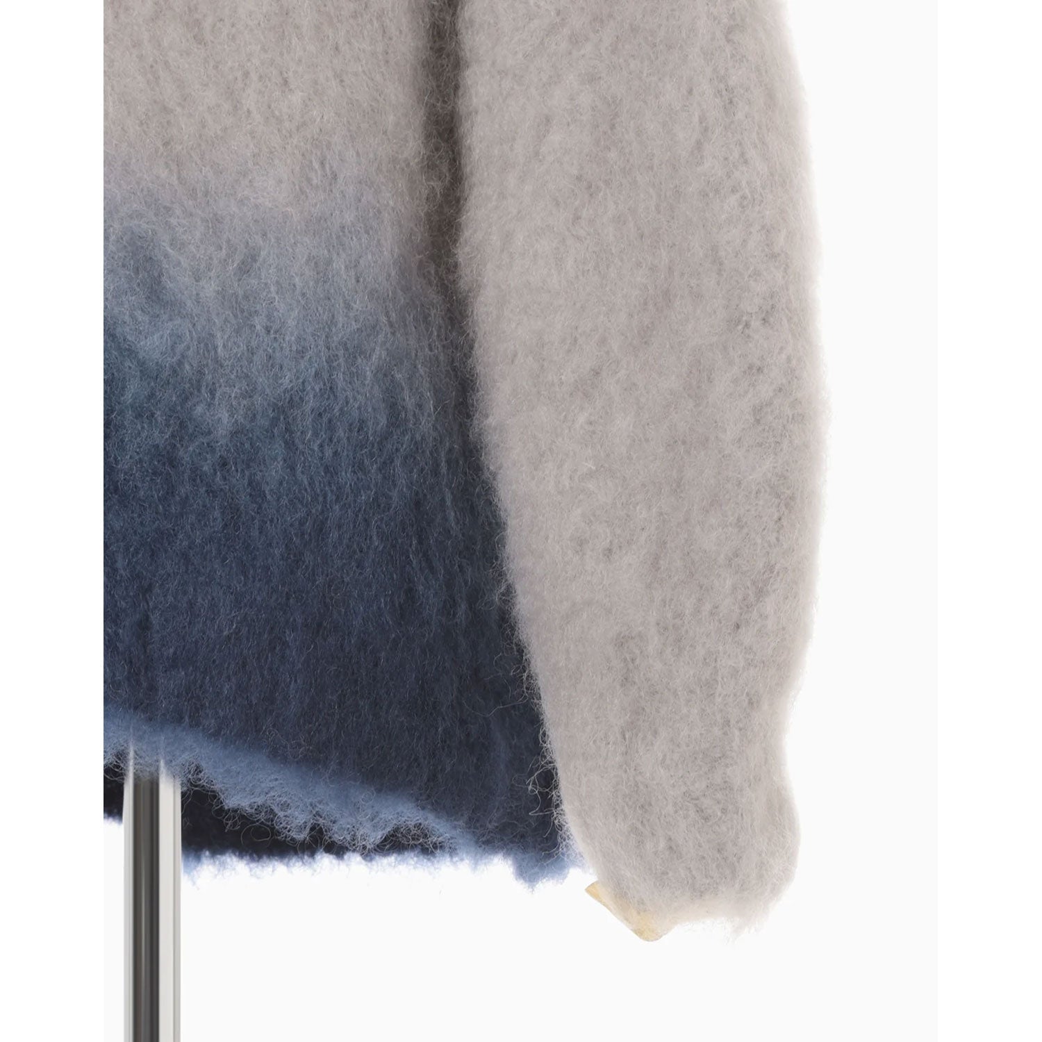 1点ずつ丁寧に手作業で起毛加工を施すことで、軽やかで柔らかな質感と、立体的で豊かな表情を生み出した。光沢感とハリのあるモヘア糸を使用し、丸みのある袖のフォルムと、フィット感のあるコンパクトな身頃が、デザインにメリハリを与える。裾に吊るし染めによる鮮やかな色彩をあしらうことで、シンプルながらも気品ある印象に仕上げている。シンプルなシルエットは、カジュアルからエレガントまで幅広いスタイルに寄り添う一着。