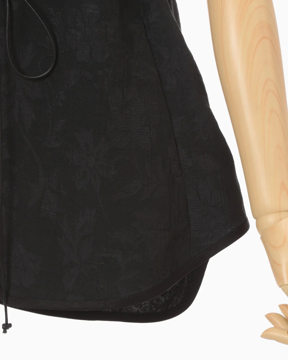 擦りガラスに浮かぶ花柄の様な立体的なジャカードが豊かな表情を生む生地。ヨコ糸の縮みによって花柄の凹凸を表現し、タテ糸にはレーヨンのブライト糸を用いることで部分的に光沢を讃える。ウエストをマークする紐や柔らかくカーブするパイピングが立体感を添え、襟元や裾の曲線的カッティングがモダンでミニマルな印象の1着。