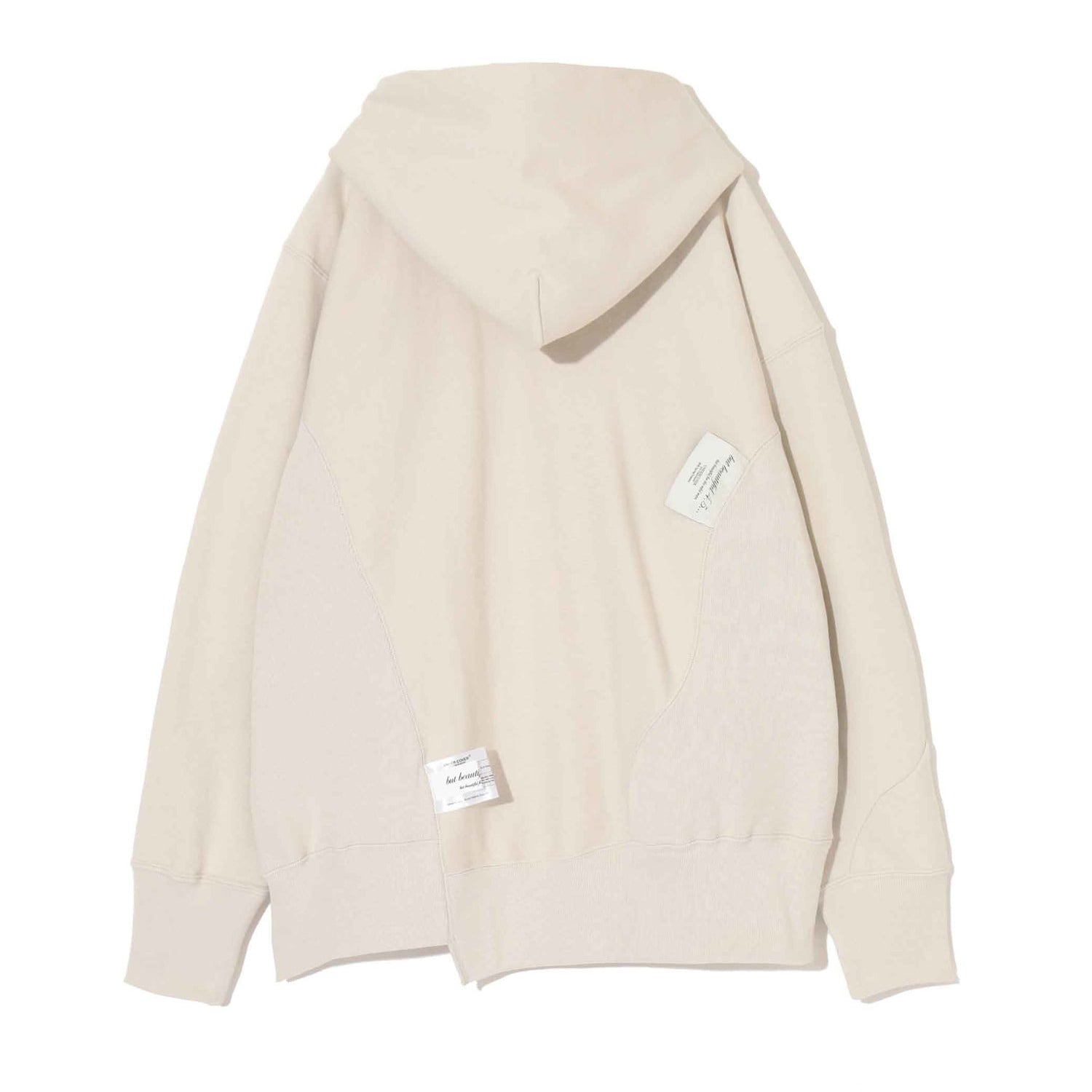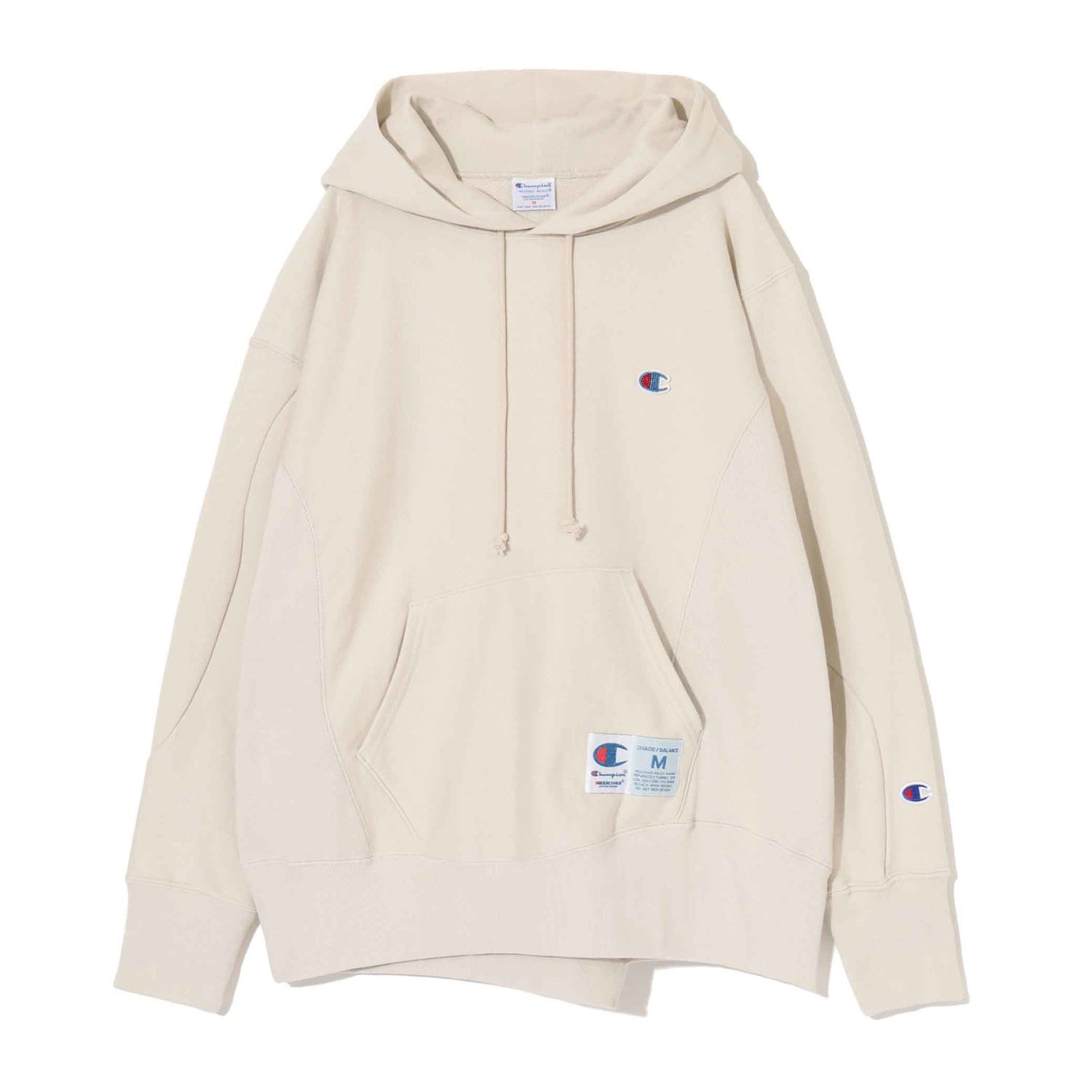 Championとのコラボレーションによるコットン裏毛スウェットフーディー。フロントにはビーズ刺繍とパッチを配し、切替デザインがアクセントに。裾にはワッペン、バックにはビッグタグをあしらったデザインです。