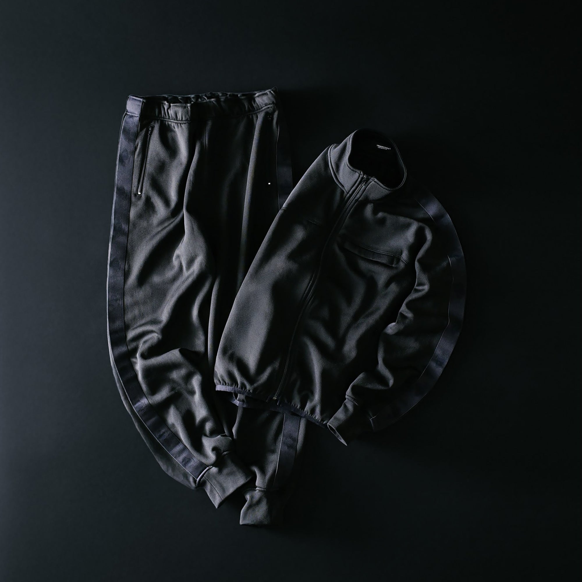 ポリエステルのダブルニット素材を使用したトラックパンツ。ダンボール構造による、適度な厚みとハリのある生地感が特徴です。