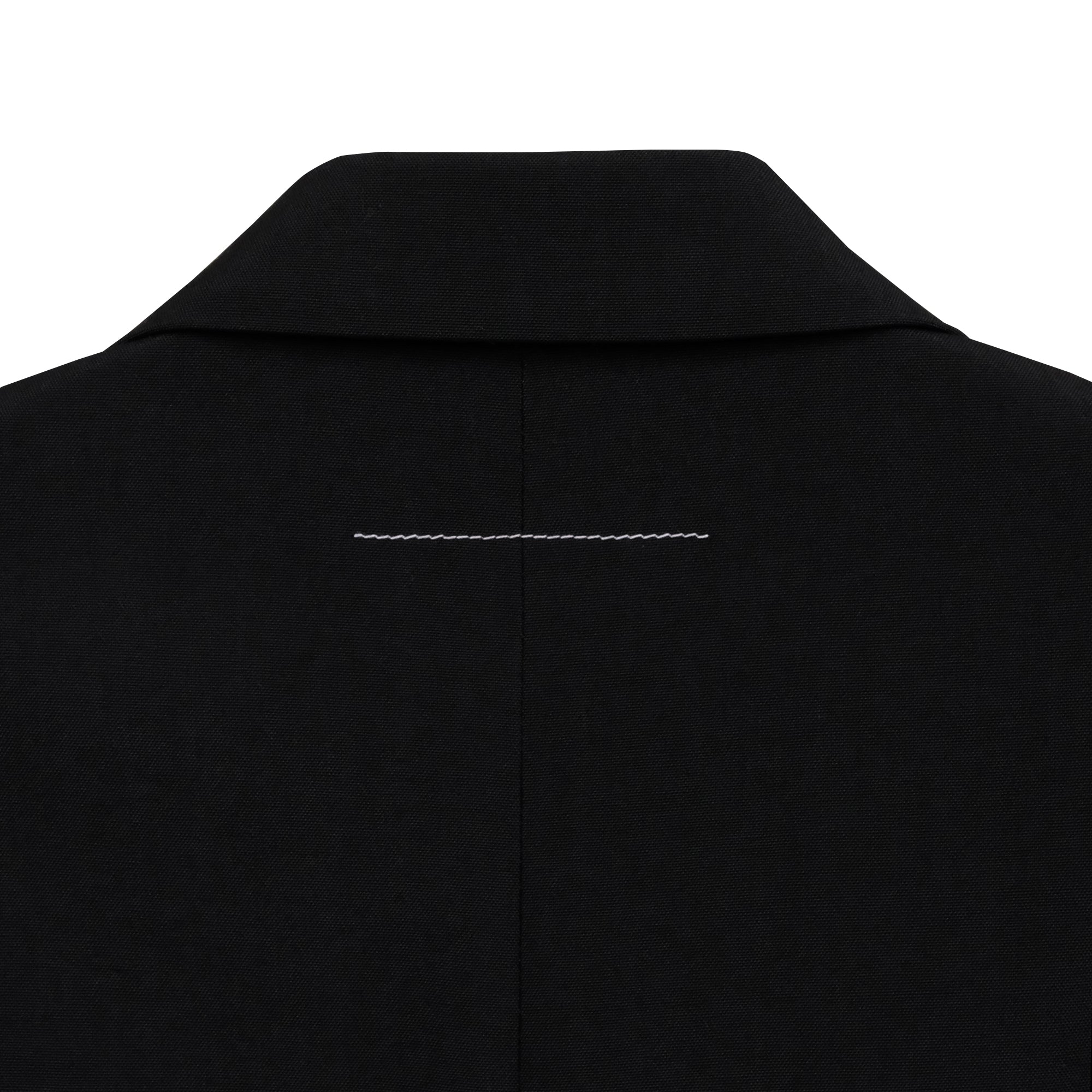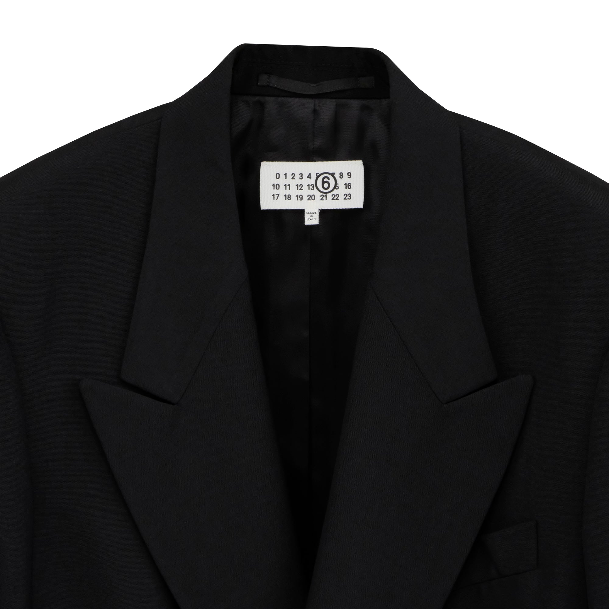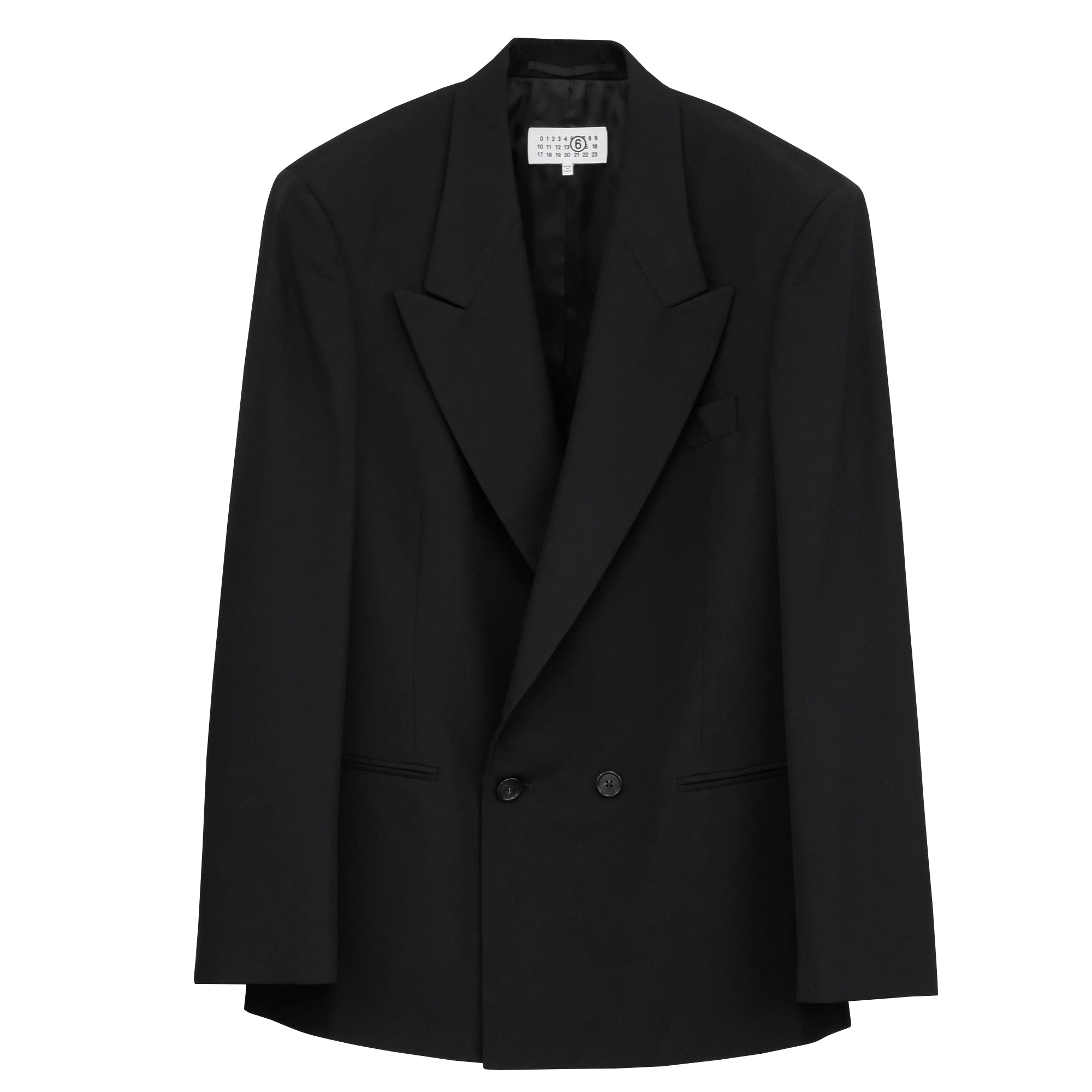 構築美が際立つ、ウールブレンド素材のダブルブレストジャケット。軽やかなウールブレンドファブリックを使用し、シーズンを問わず洗練されたスタイルを演出します。パッド入りのショルダーと肩幅を広く取ったカッティングにより、彫刻的で存在感のあるシルエットを形成。無駄を削ぎ落としたクリーンなラインが、ミニマルでありながら力強い印象を与えます。バックスタイルには、MM6を象徴する1本の白いステッチを配置。控えめながらもブランドのアイデンティティを感じさせるディテールが、デザインに静かな個性を添えています。