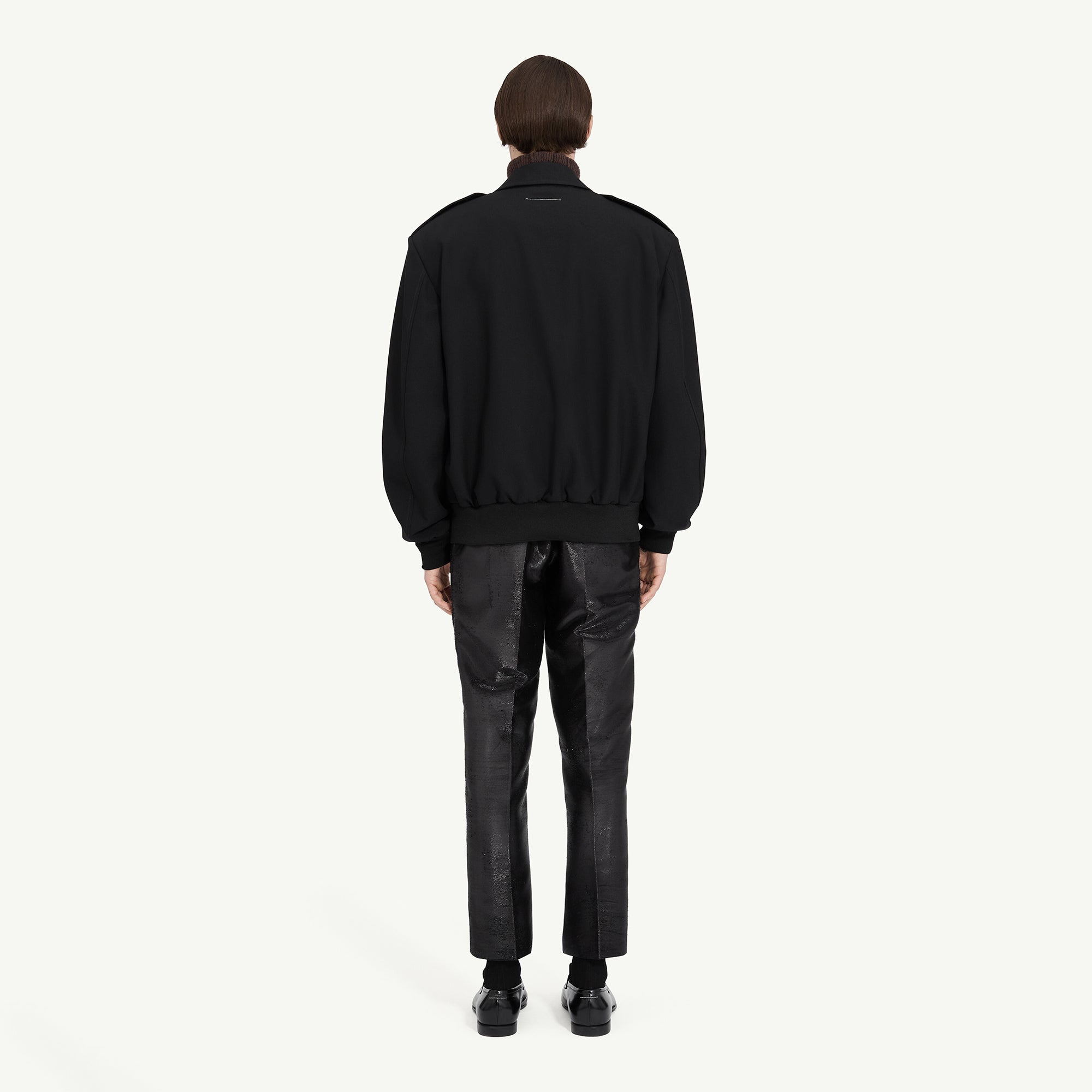 肩章や構築的なシームなど、ミリタリーの要素を取り入れたウール製ボンバージャケット。リブ編みの裾と袖口がシルエットにほどよいメリハリを与え、立体的なフォルムを際立たせます。バックには、MM6のアイコニックなディテールである1本の白いステッチをあしらい、控えめながらもブランドの存在感を感じさせる仕上がりに。洗練されたデザインと上質な素材が調和した一着です。