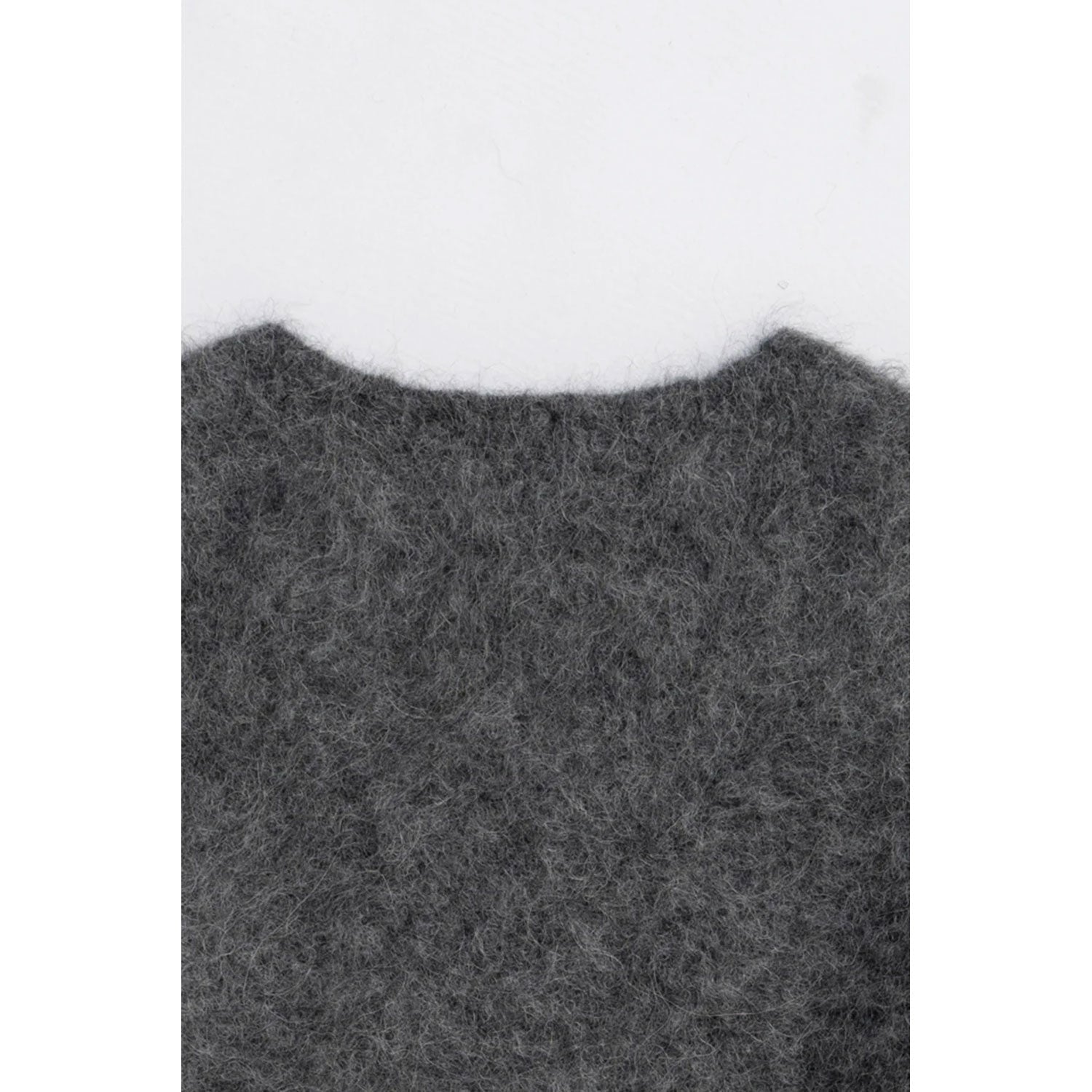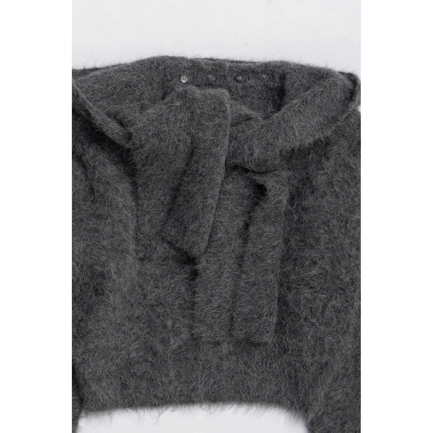 マフラーを取り外すとシンプルなVネックニットになり、幅広いスタイリングに活躍する一着。