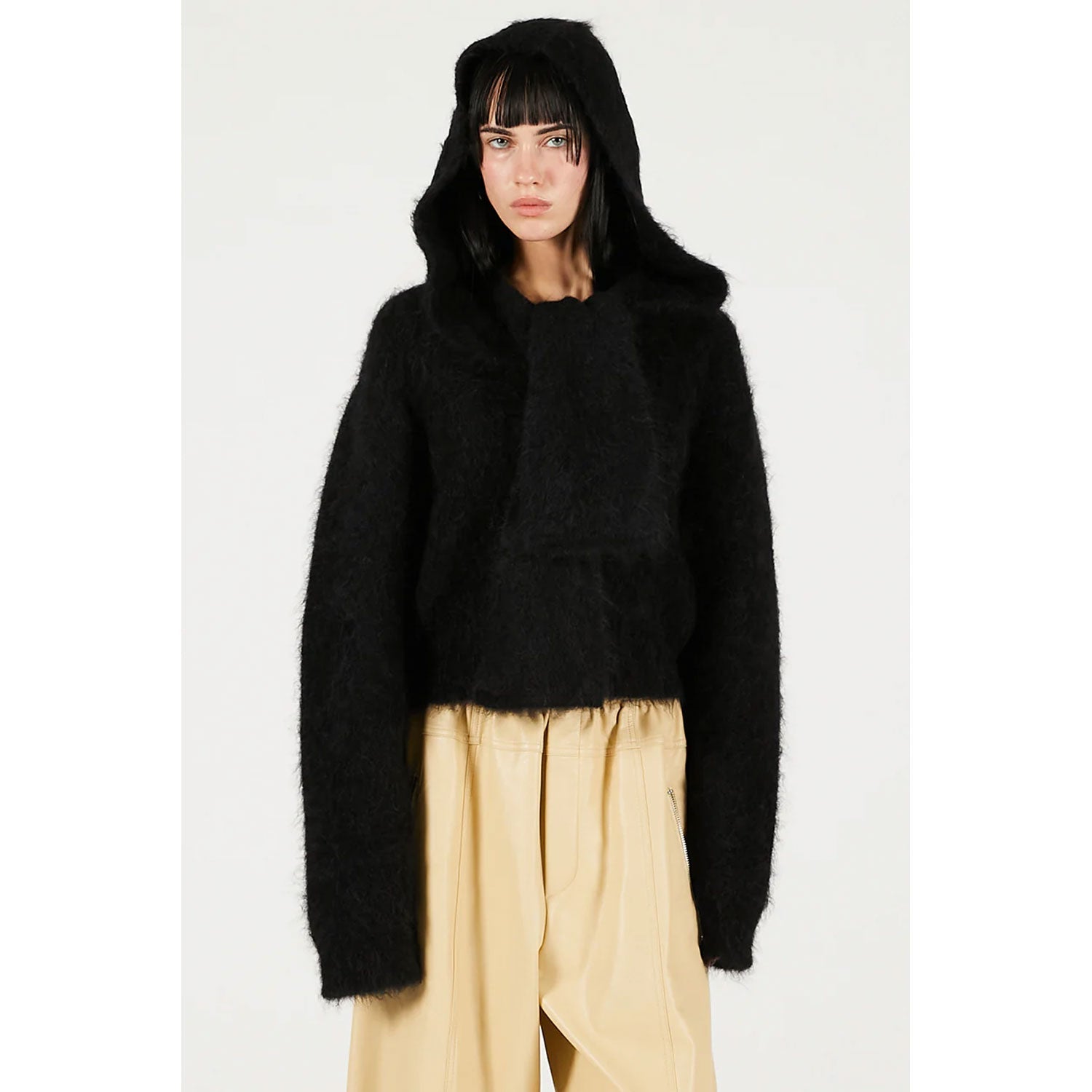 素材感の違うレザーやサテンなどのボトムとのスタイリングがおすすめ。