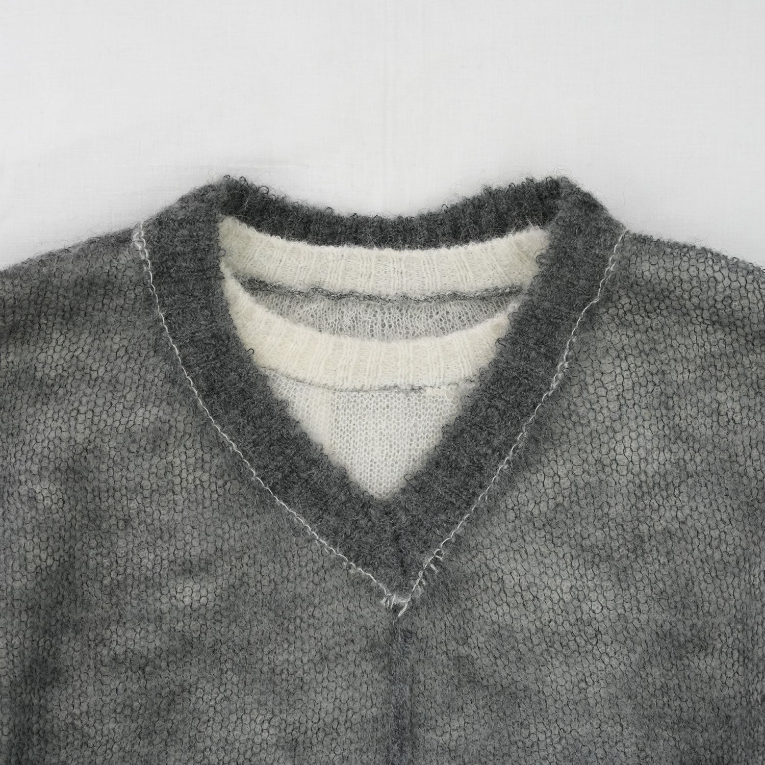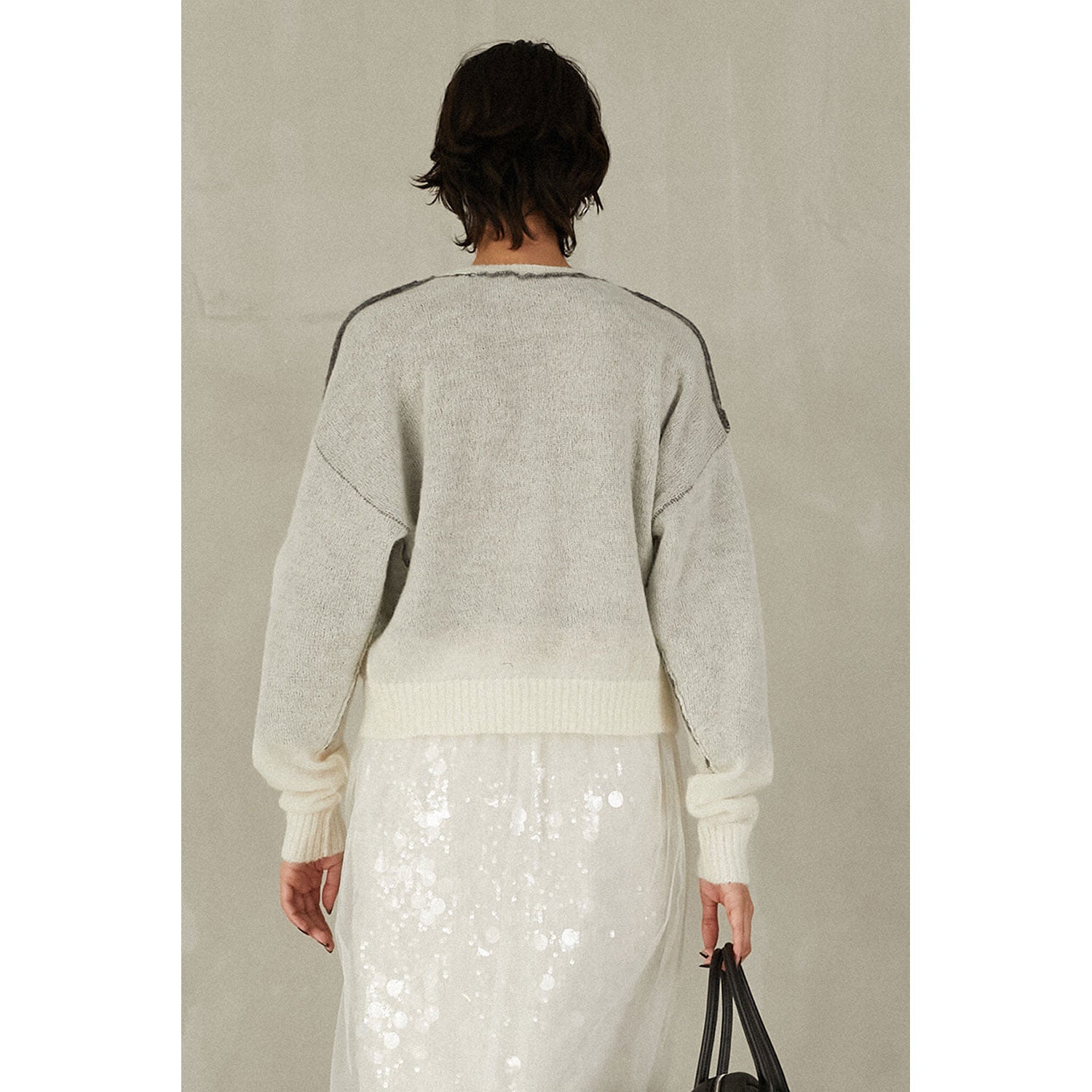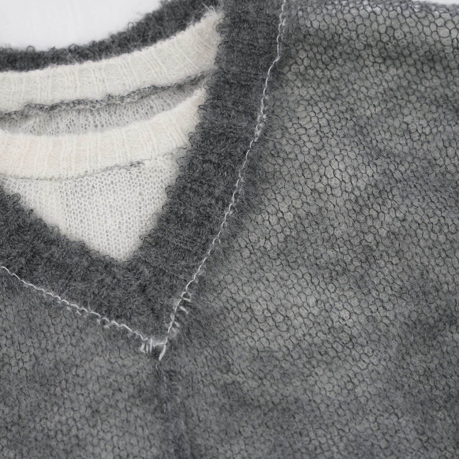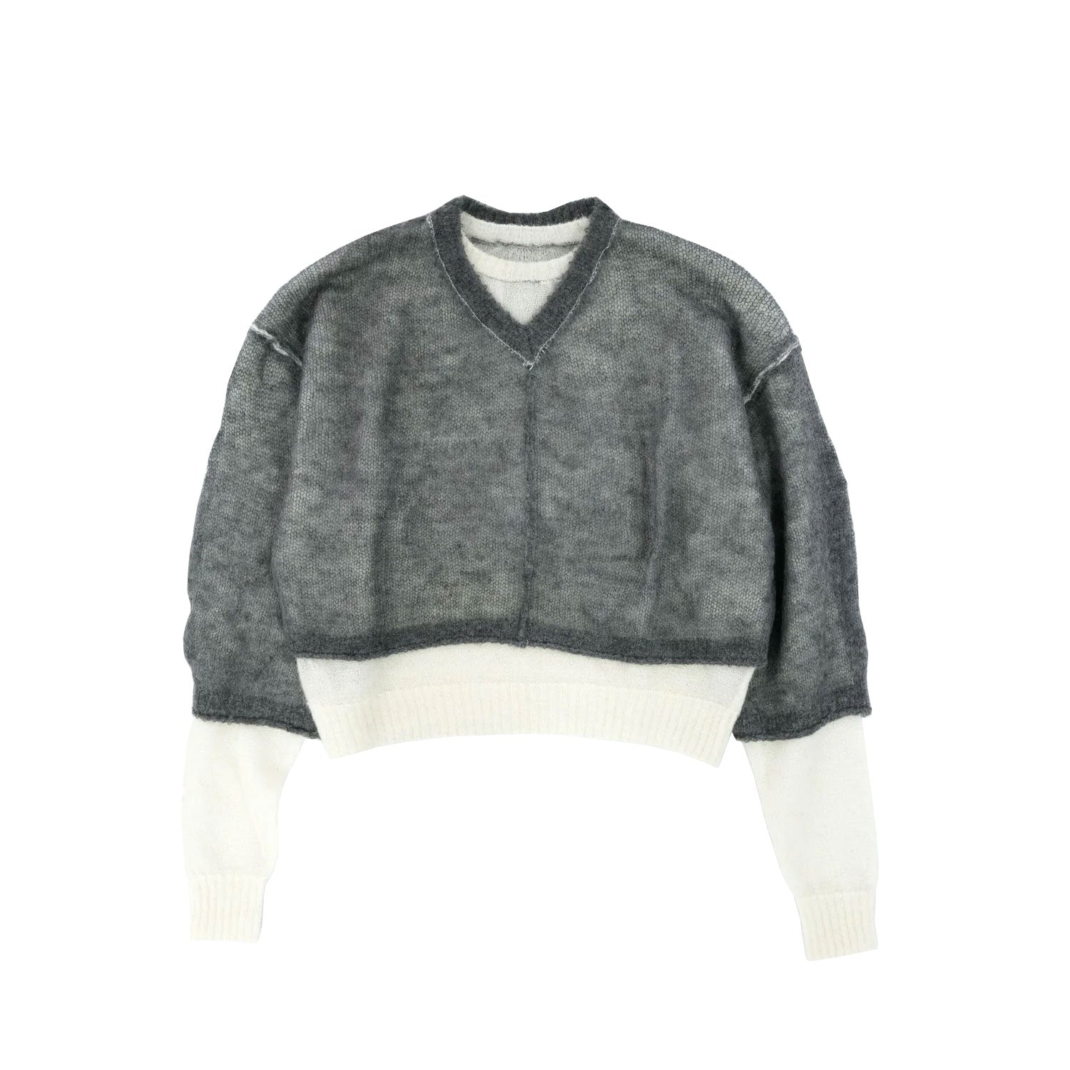 レイヤードしたようなデザインとバイカラーがキャッチーなニット。