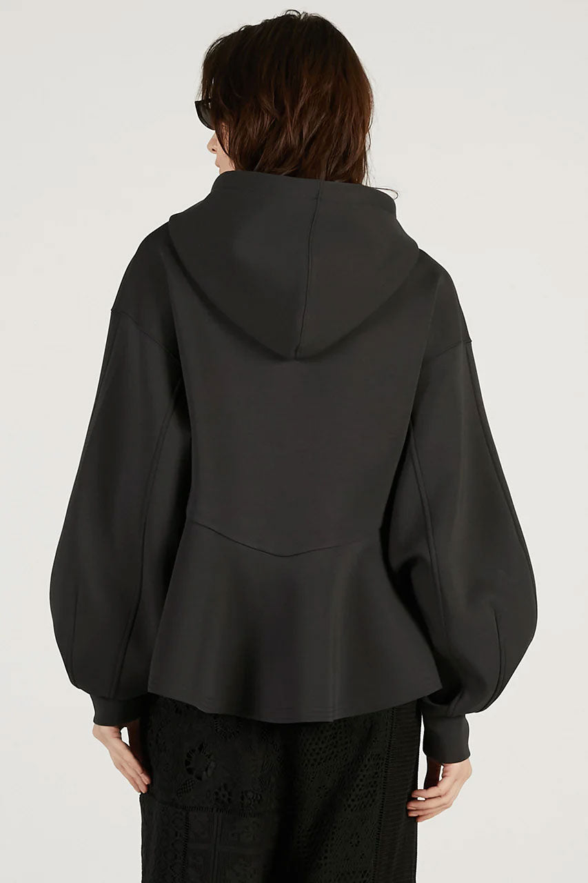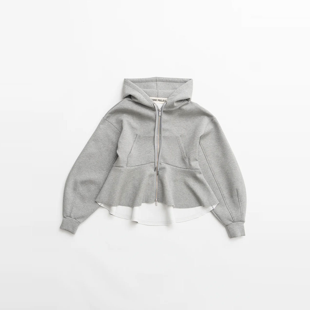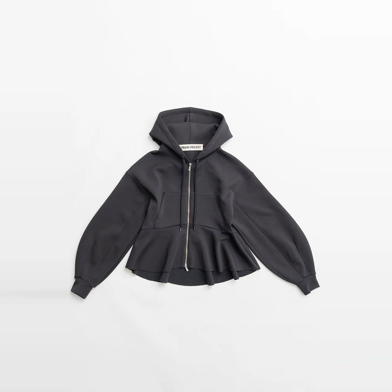 立体的なフォルムのペプラムフーディー。ウエストラインを自然にひき立てるペプラムデザインがカジュアルなフーディーに女性らしさをプラス。切りっぱなしのヘムデザインで程よい抜け感をプラス。