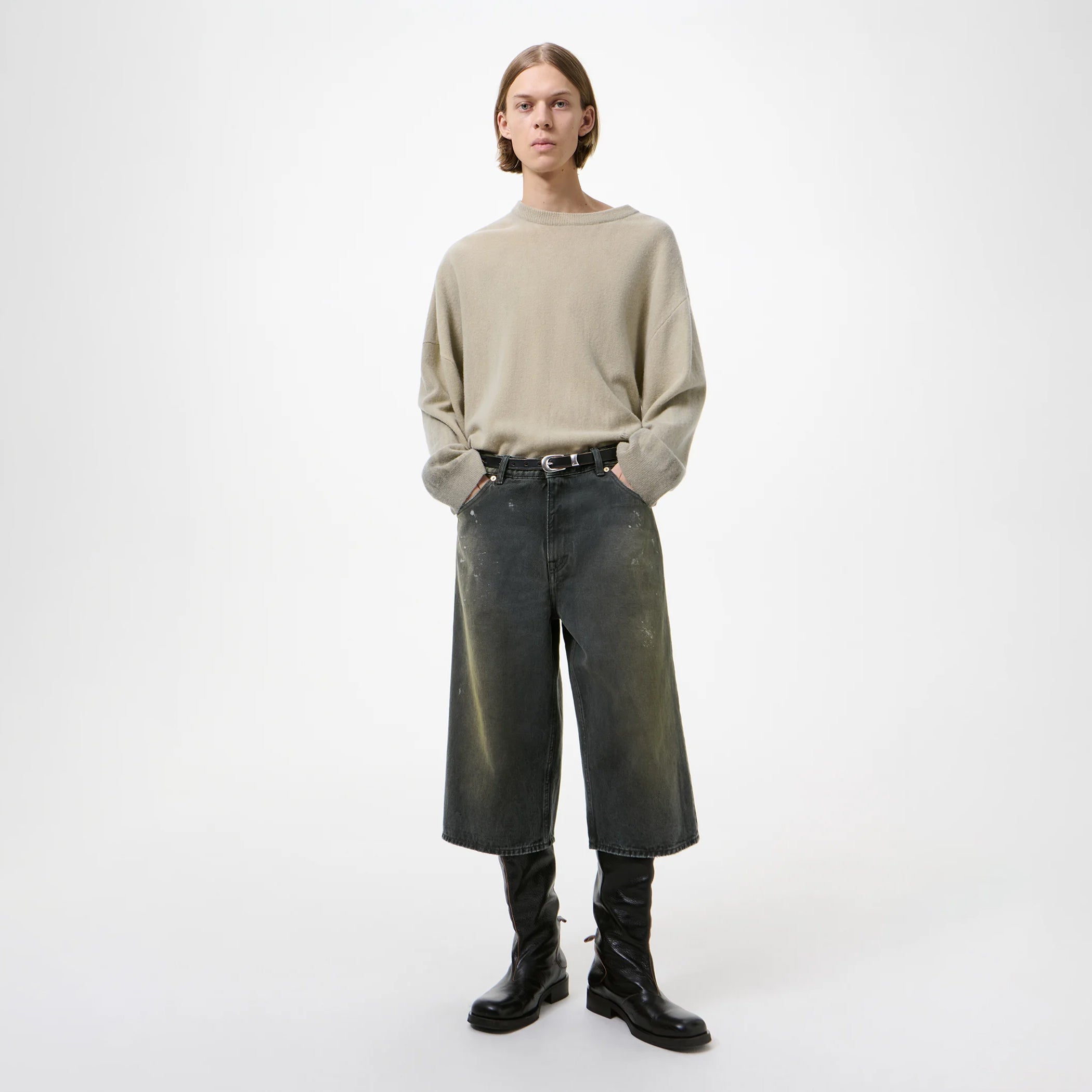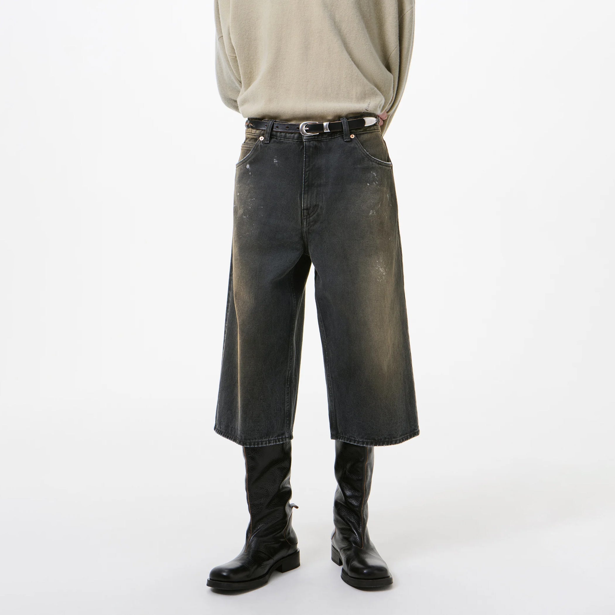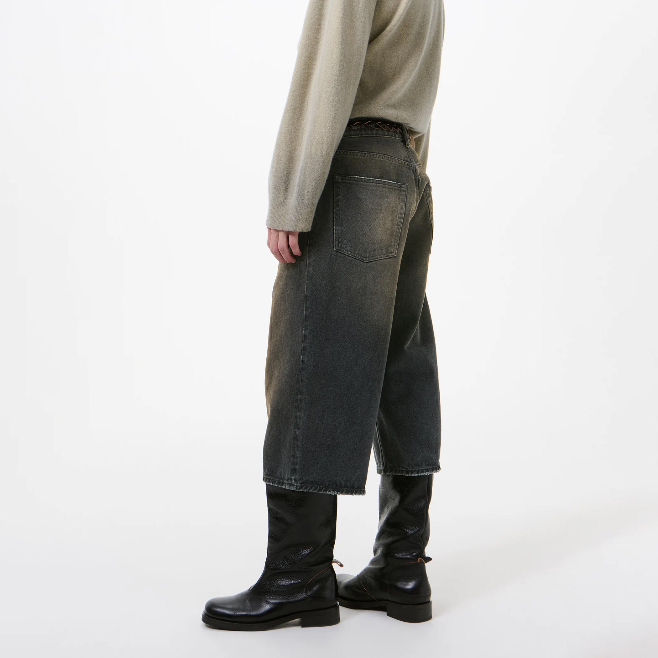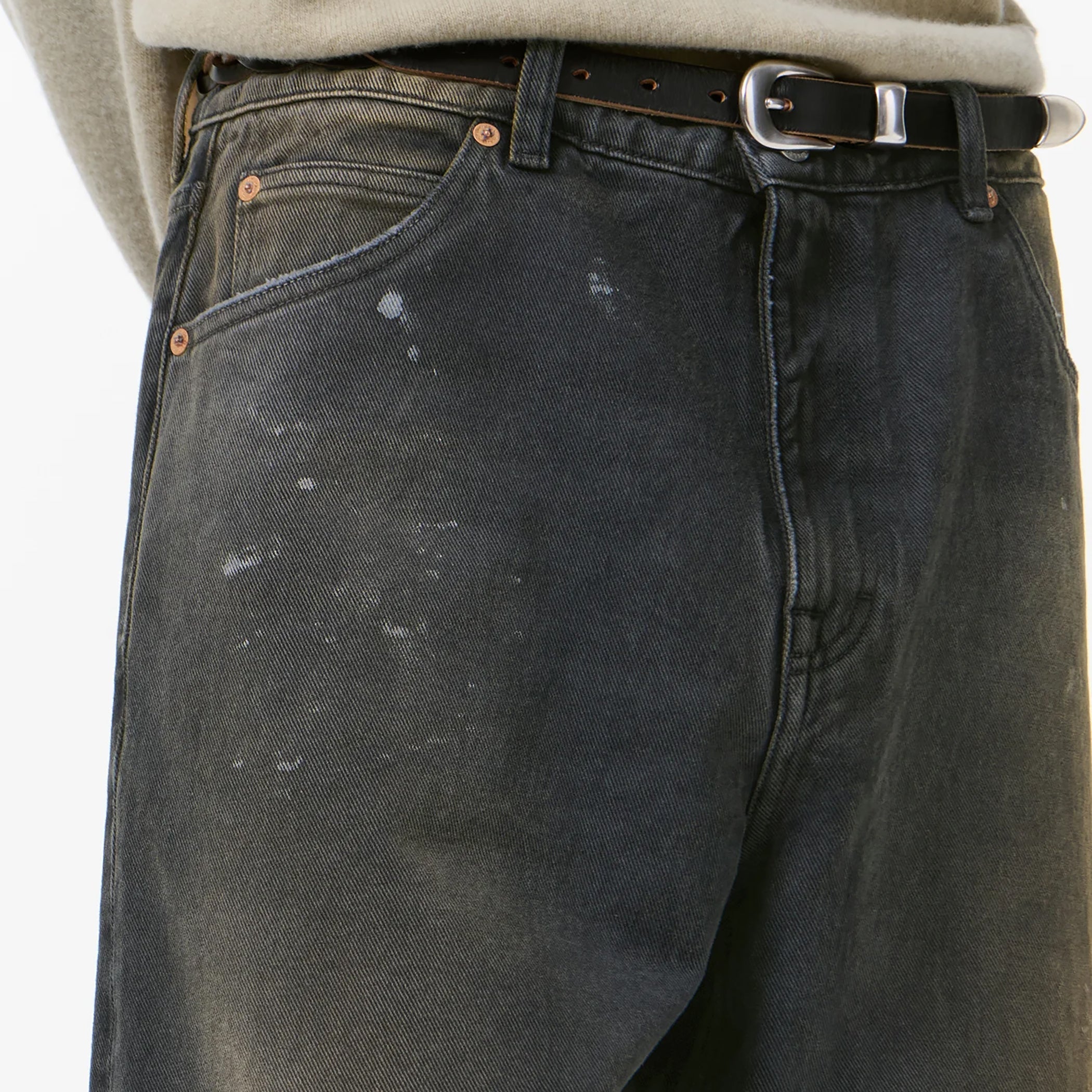 ゆったりとしたフィット感にワイドなクロップド丈のシルエット。YKK製ジップフライ、スチールリベット、5ポケット構造を採用し、バックにはブランドのエンボス加工パッチを備えています。