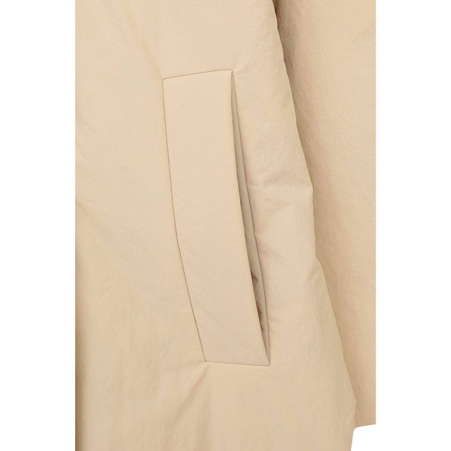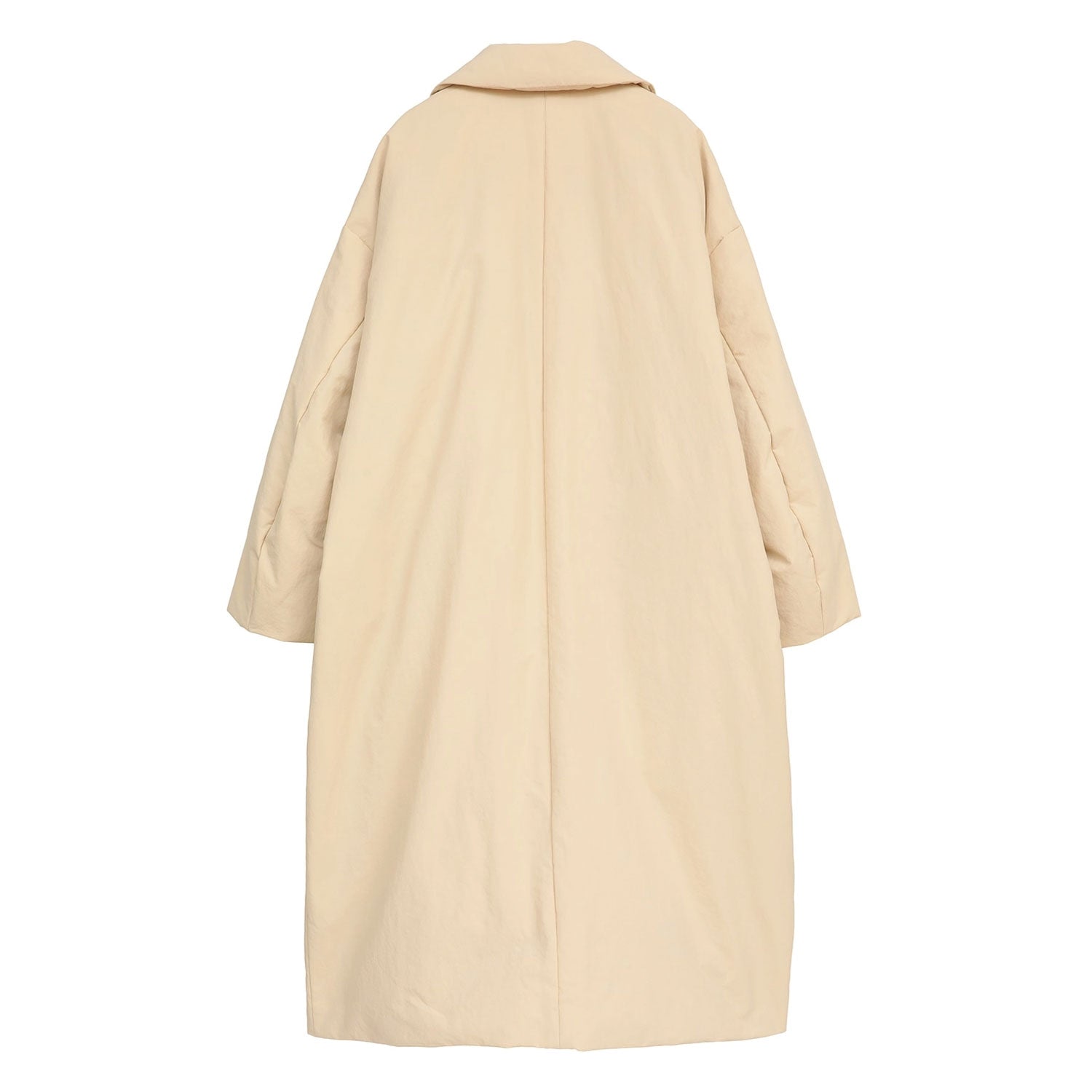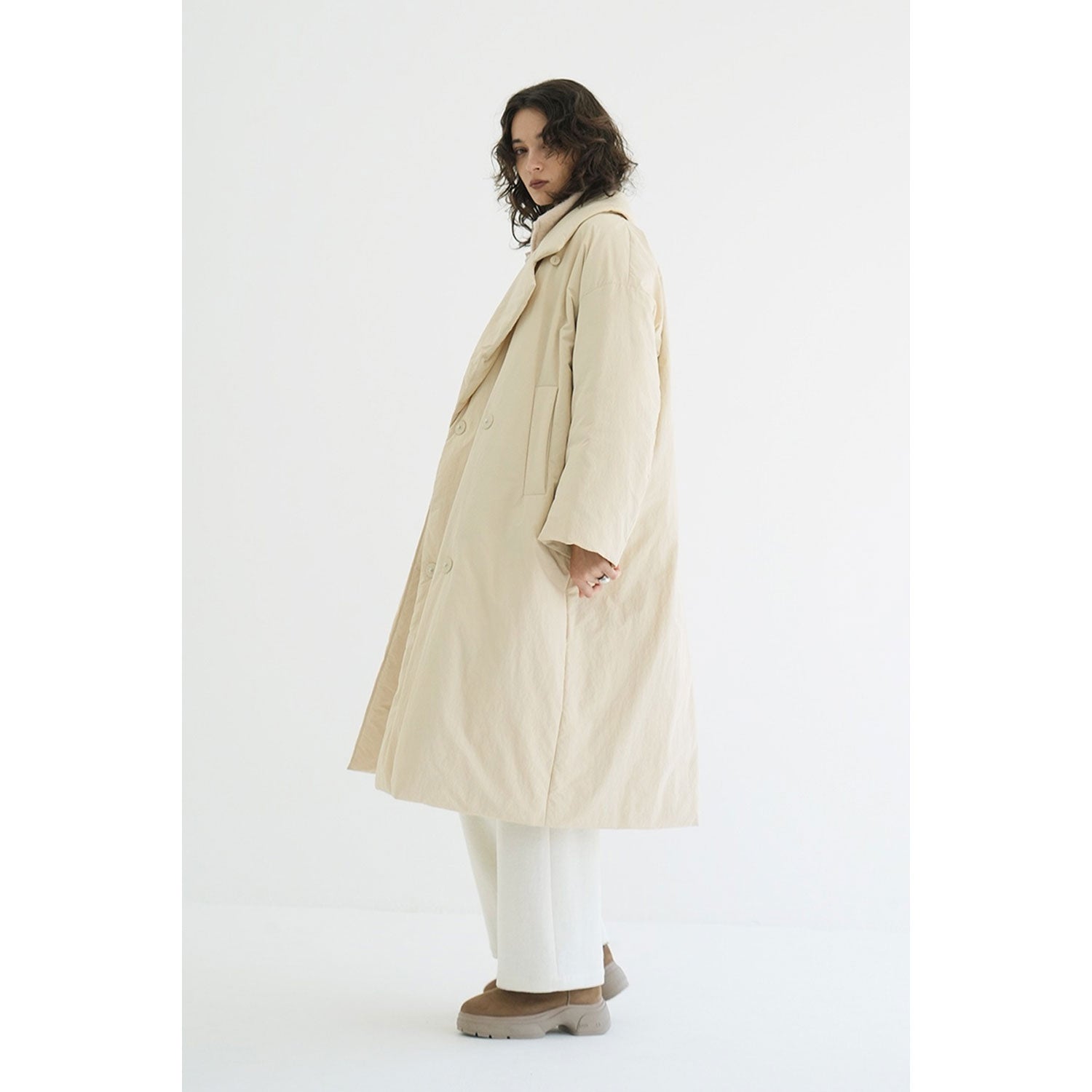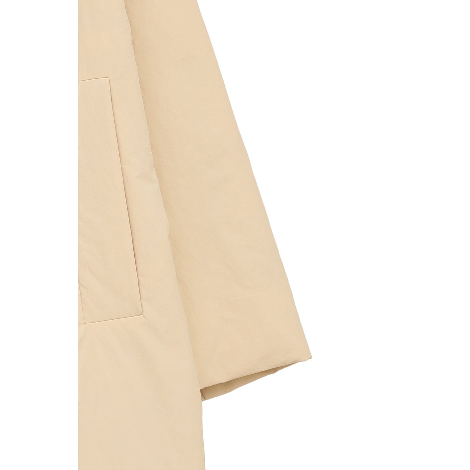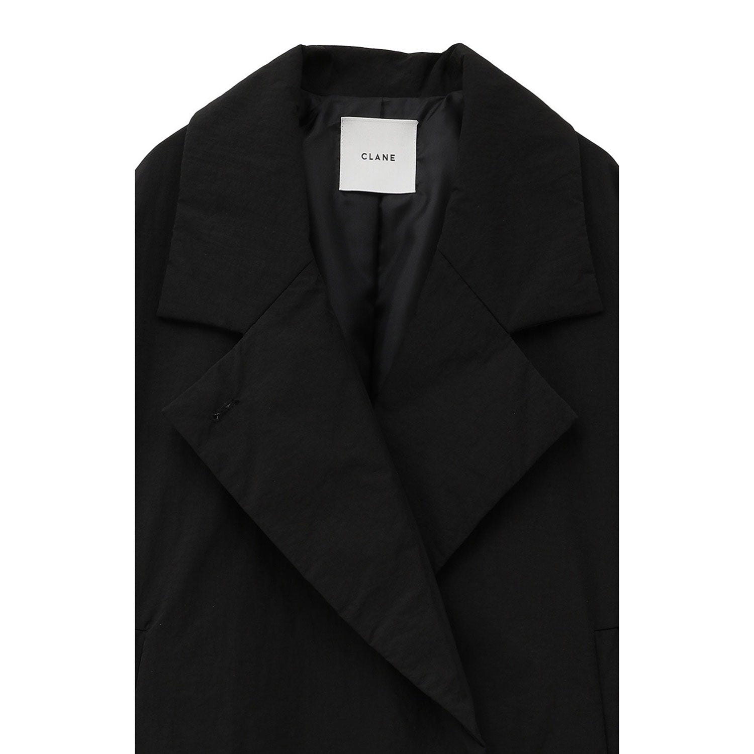 ダウン80%、フェザー20%の薄手の中綿を使用。生地にはワッシャー加工を施し、ナチュラルなシワ感でさりげない表情をプラス。アームホールを広めに設計することで、CLANEのデザインニットなど厚手のアイテムを合わせてもごわつきにくく、真冬でもしっかりと着込めます。