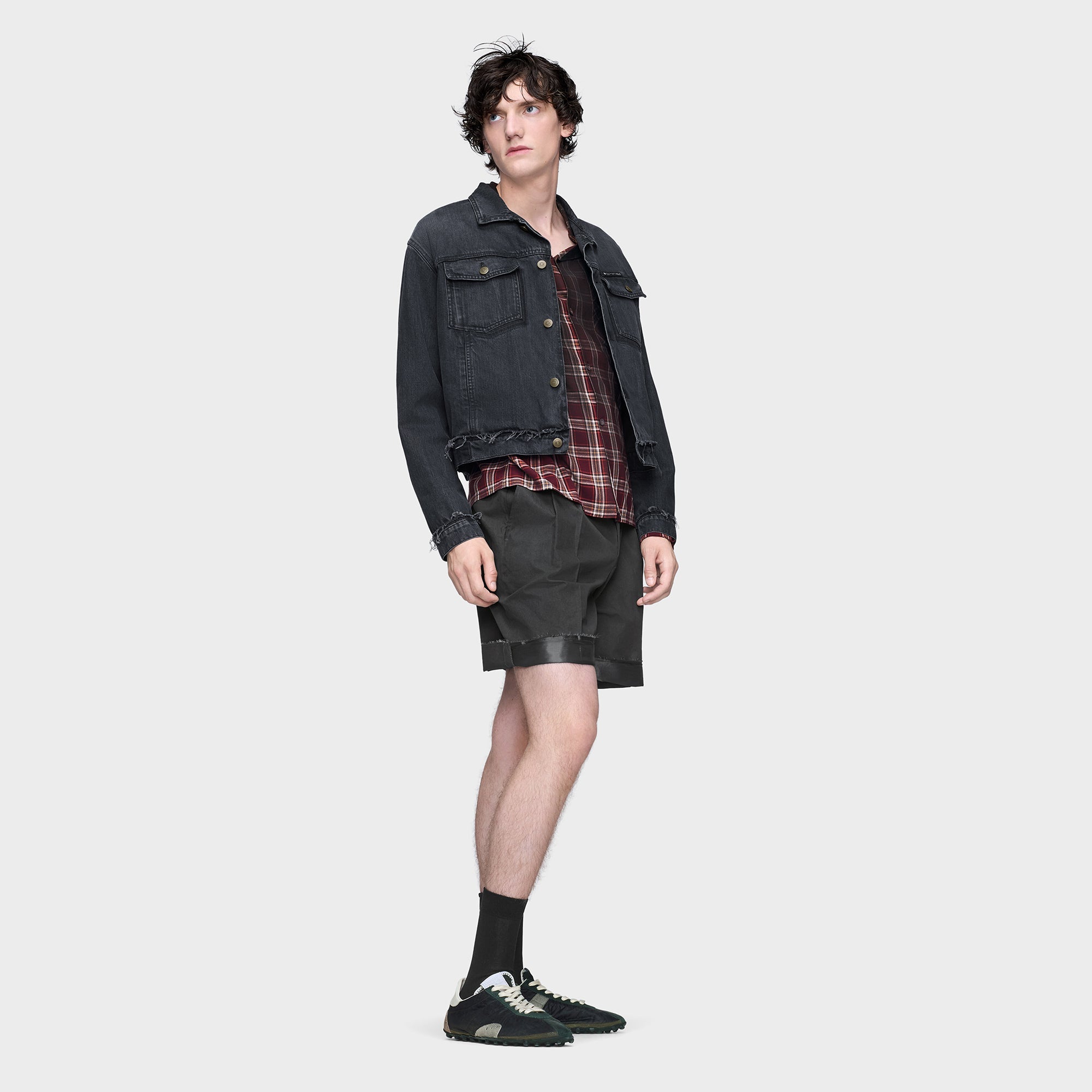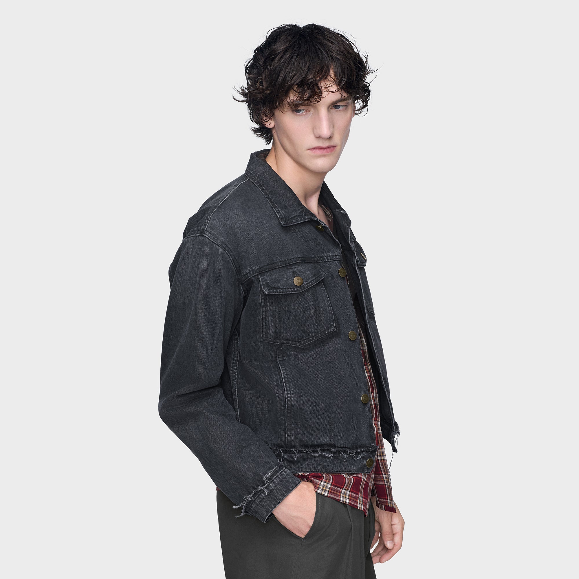 14オンスブラックデニムを使用。シャツカラー、フロントボタン開閉仕様。イタリア製。