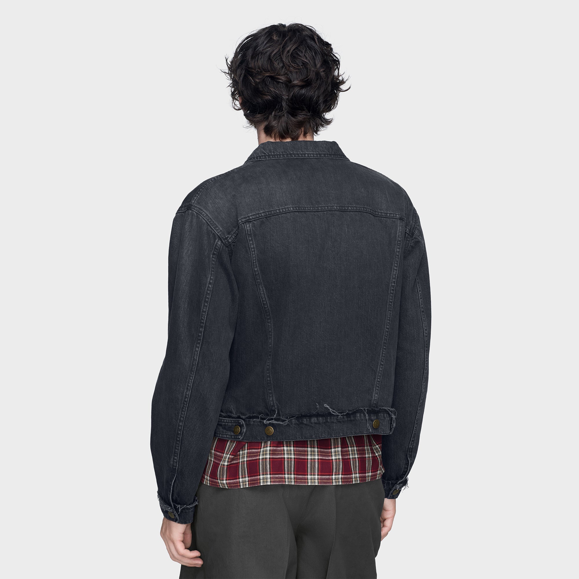 フェード感や柔らかなライン、裾や袖口のフリンジ加工によって着古したような風合いに仕上げられています。海軍のテーラードジャケットの構造をベースに、ワークウェア由来のデニム素材で再構成したデザイン。背面にはメゾンを象徴する4本の白いステッチを配置しています。