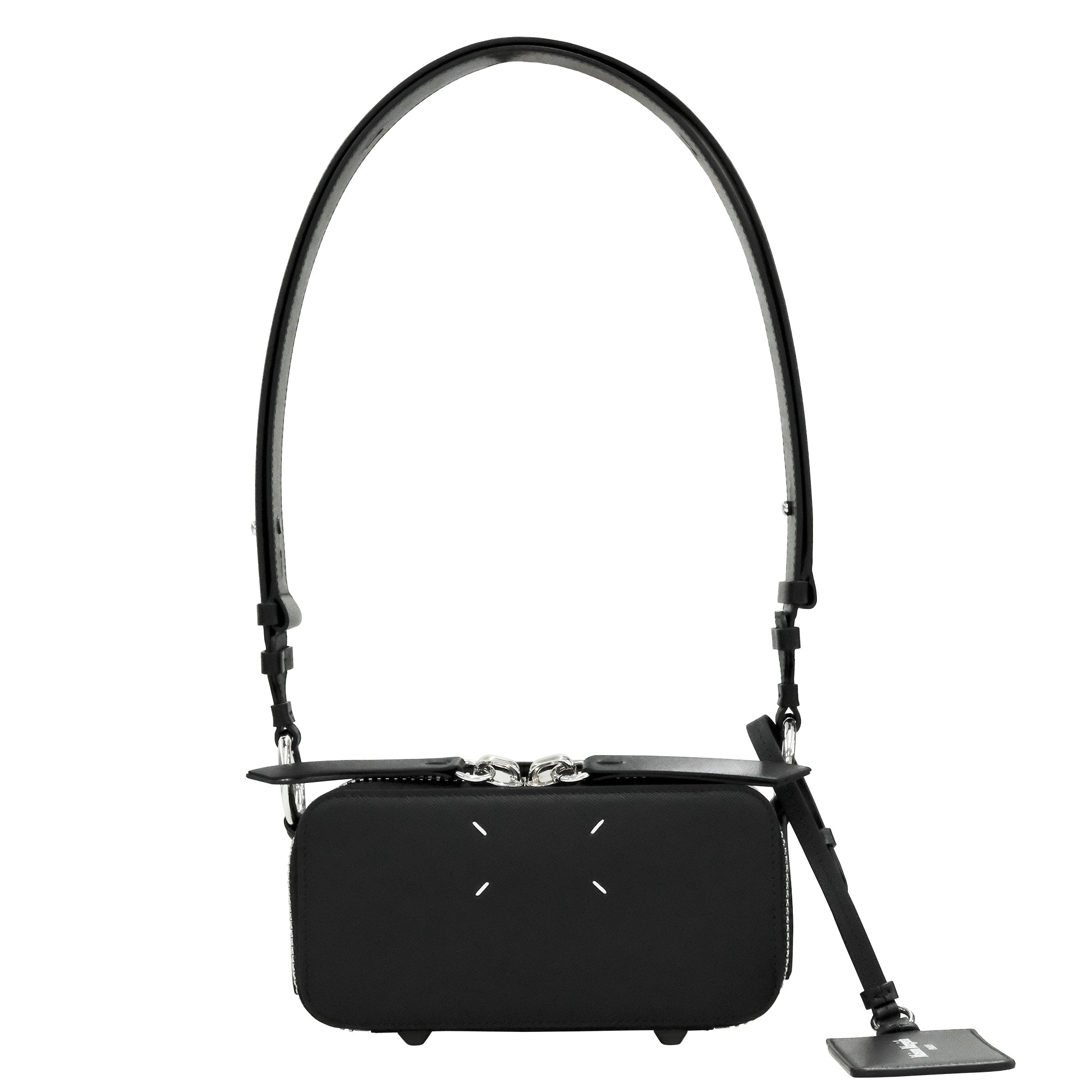 アイコニックな要素をミニマルに落とし込んだカメラバッグ。マイクロサフィアーノレザーとカーフレザーを組み合わせた上質な素材使いにより、繊細な光沢と耐久性を兼ね備えています。フロントにはメゾンを象徴するホワイトのステッチディテールを配置。ジッパー開閉のすっきりとしたフォルムに、調節・取り外し可能なショルダーストラップを備え、ハンドバッグとしてもクロスボディとしても活躍します。レザー製の取り外し可能なラゲッジタグと、底部の真鍮製底鋲がデザインを引き締めるアクセントに。シーンを問わず洗練された印象を与える、コンパクトながら存在感のある一品です。