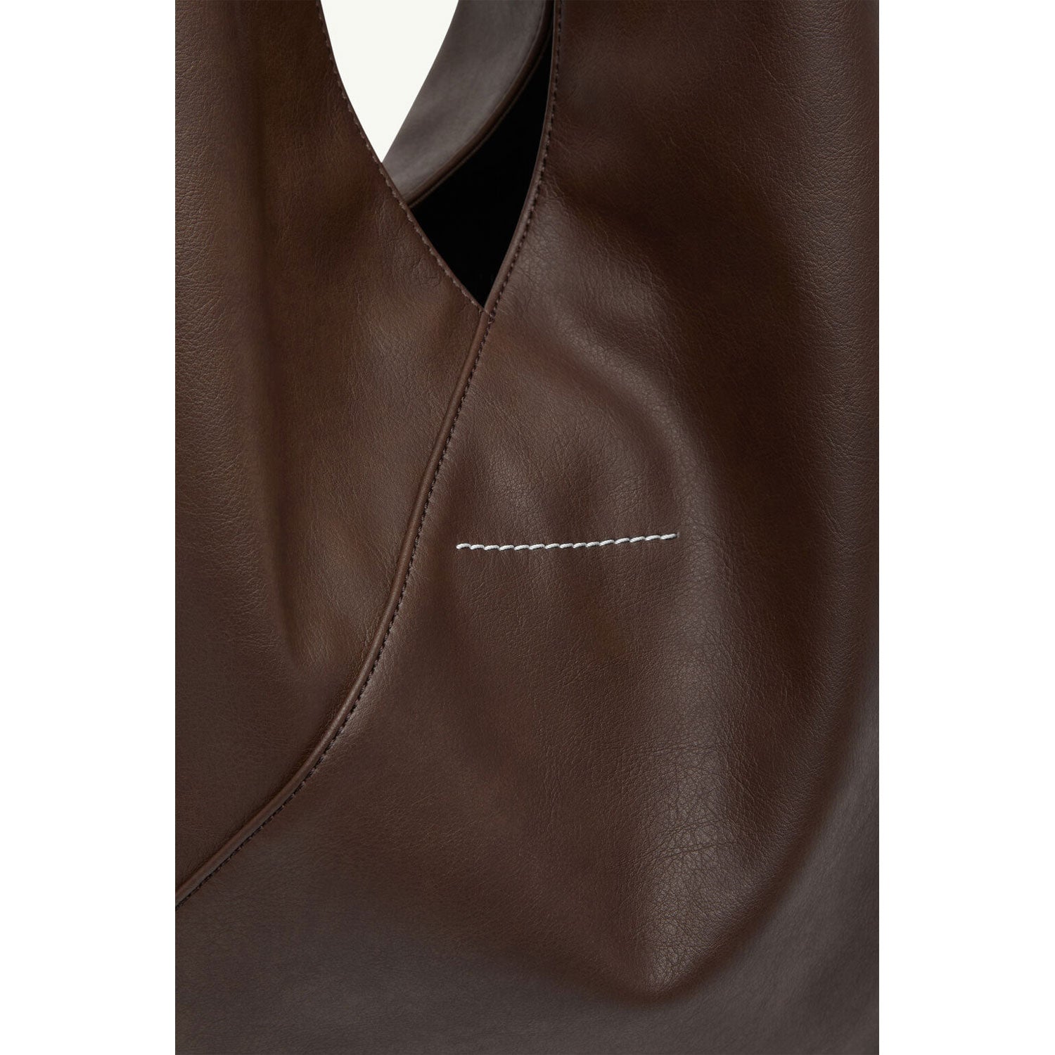 2009年秋冬コレクションで初登場したMM6の象徴的なバッグ。折り紙から着想を得た三角形のフォルムが特徴です。レザー風素材を使用したバージョン。両サイドのボタンでフォルムを変形させることができ、メゾンの脱構築的な精神を体現しています。バックには1本の白いステッチが配され、ブランドのシグネチャーを印象付けています。