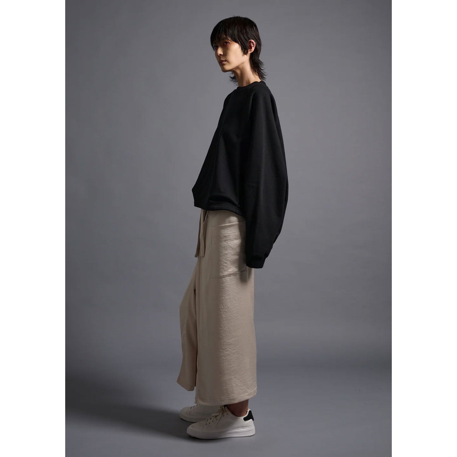 定番のワイドボディラグランスウェットシャツのボディはそのままに、裾と背中のタックでユニークな立体感のあるシルエットのスウェットです