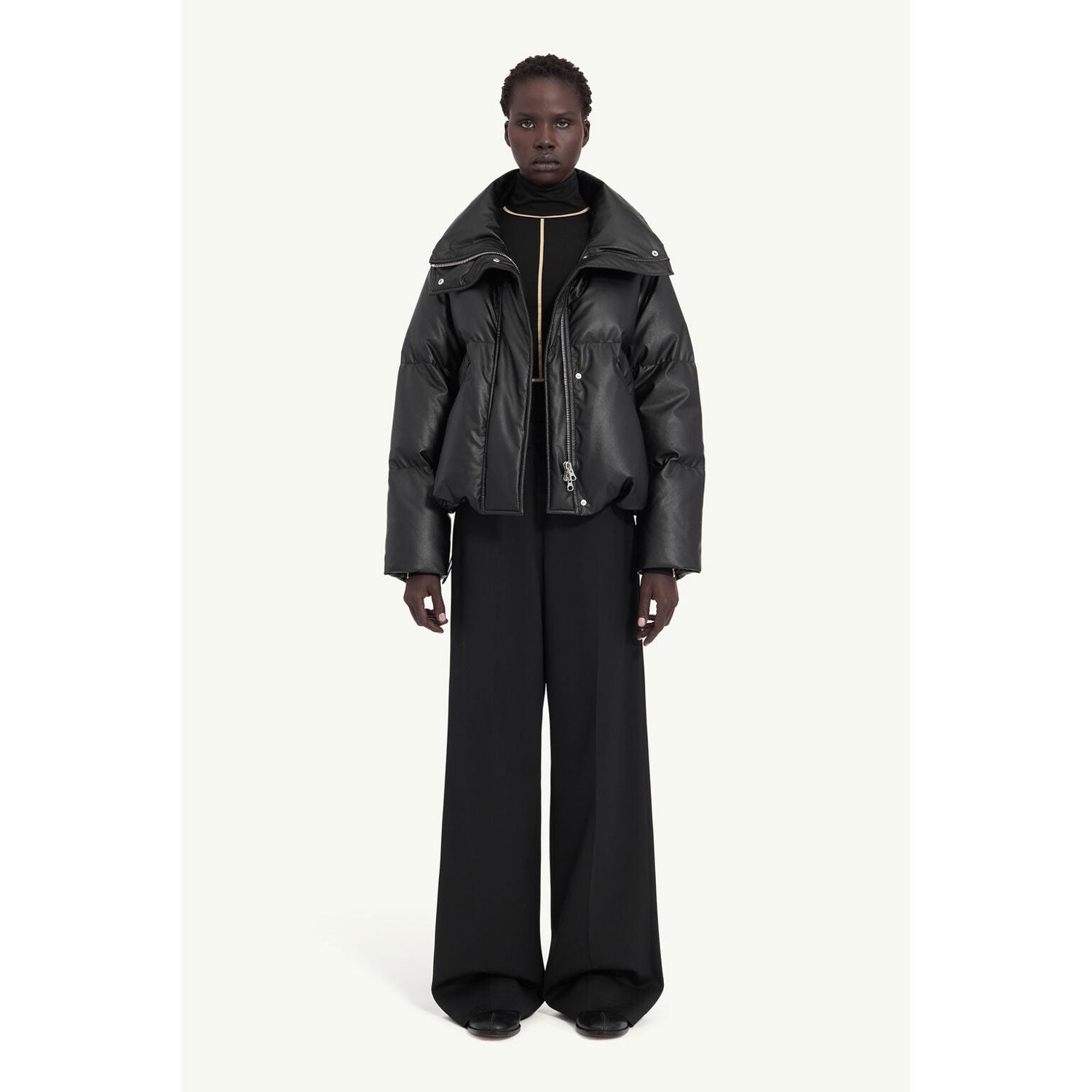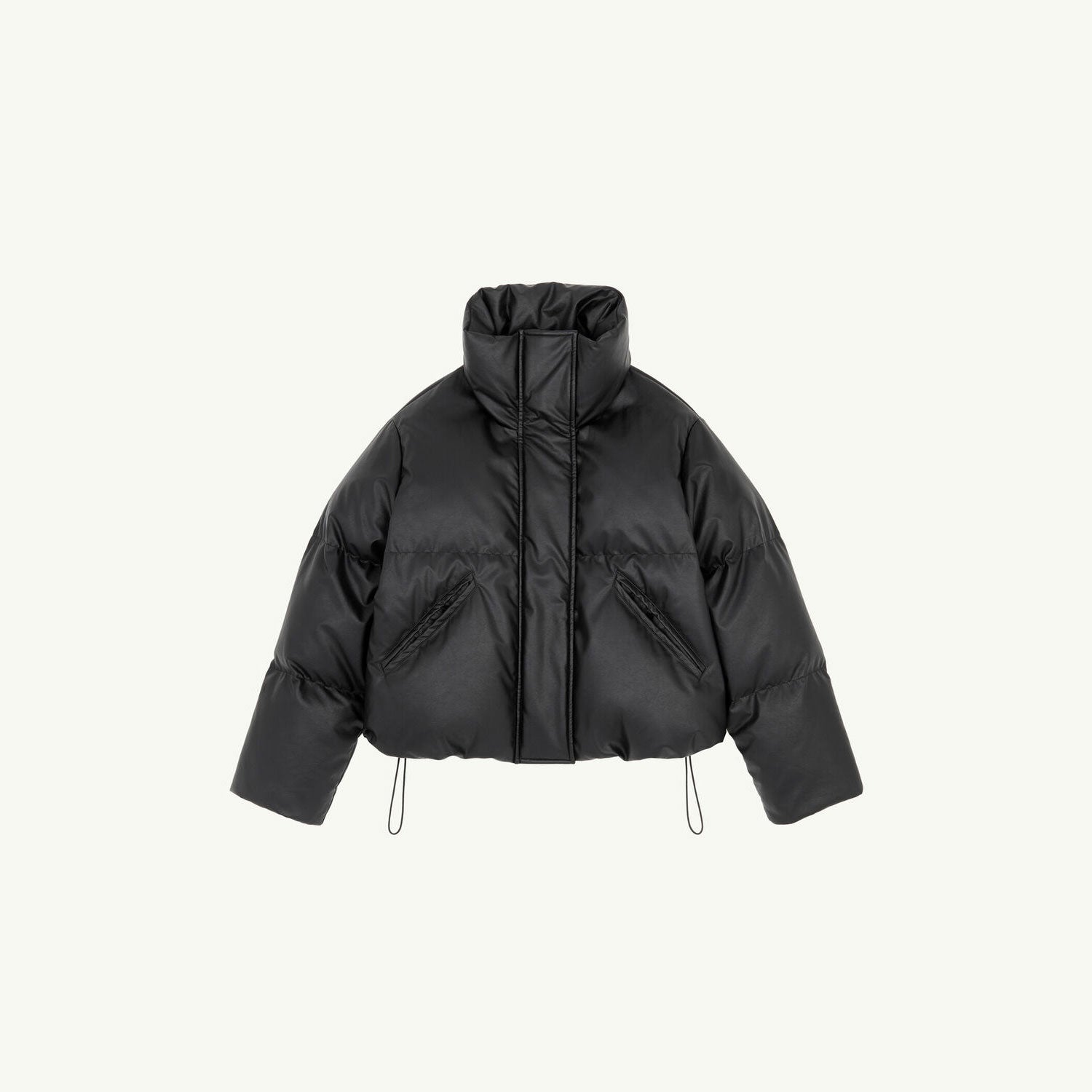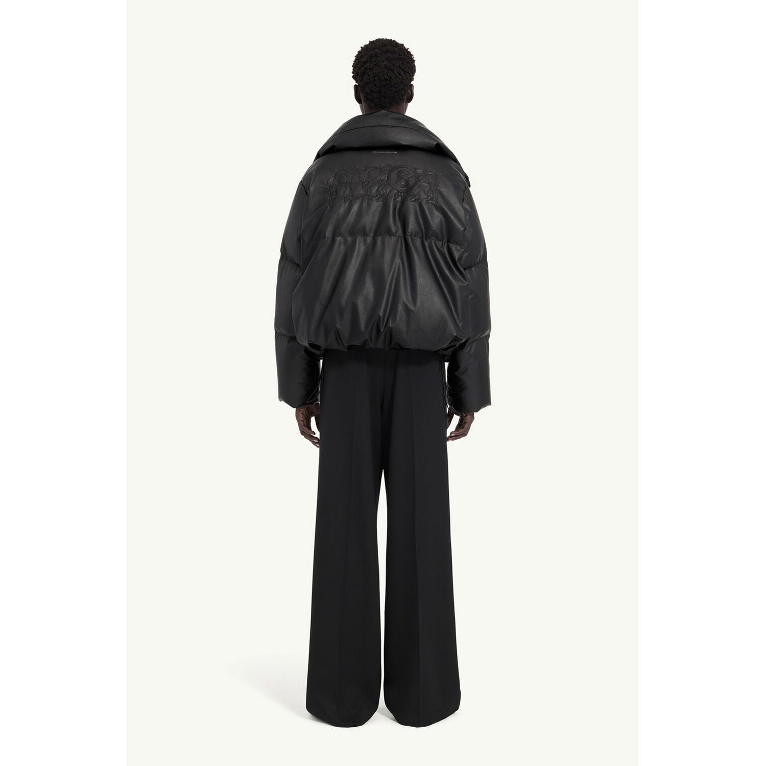 テクニカルな機能性とMM6特有の脱構築的なアプローチを融合させたパデッドジャケット。誇張されたスタンドカラーとオーバーサイズのプロポーションで再構築しました。斜めに配されたフラップポケットがユーティリティを添え、背面にはMM6のナンバリングロゴが刺繍されています。1本の白いステッチが、アイデンティティを示すディテールとして施されています。
