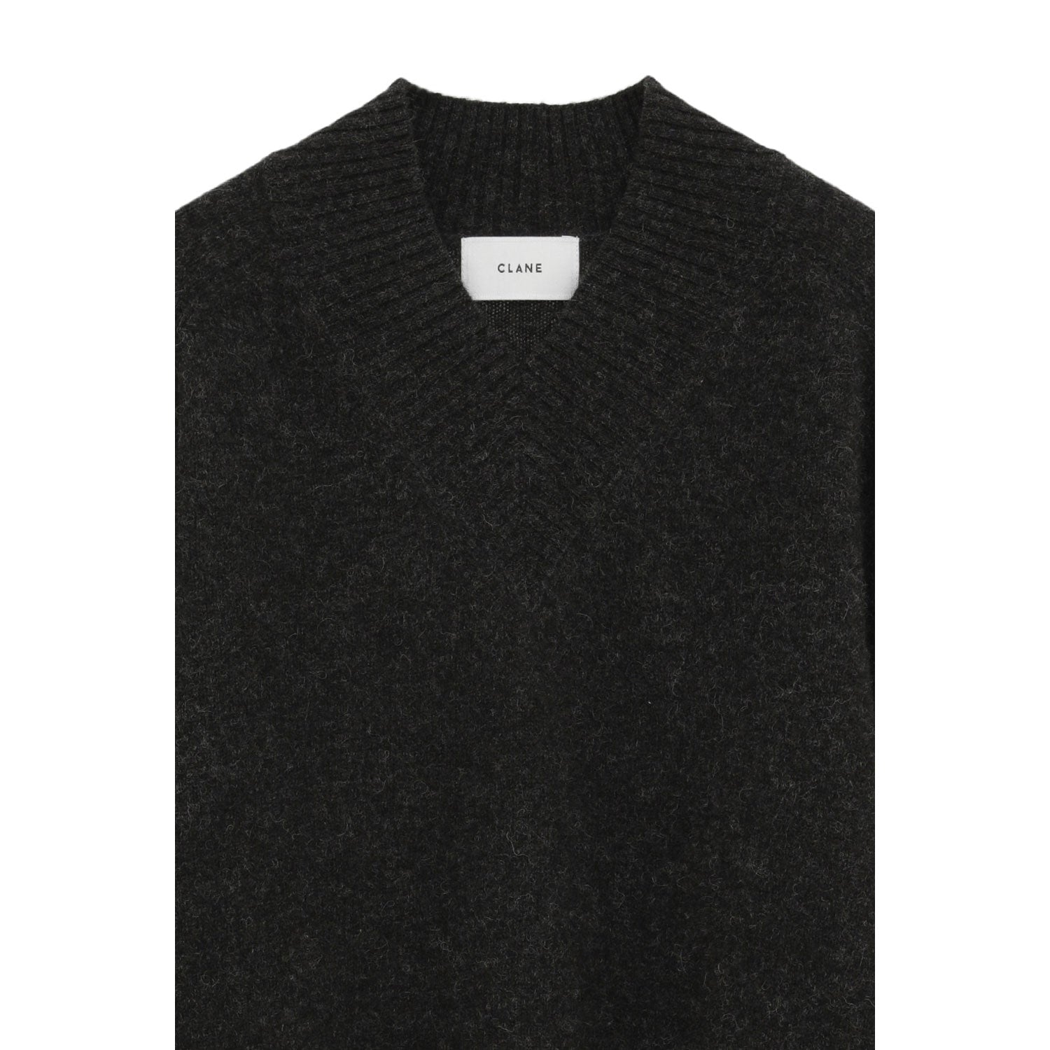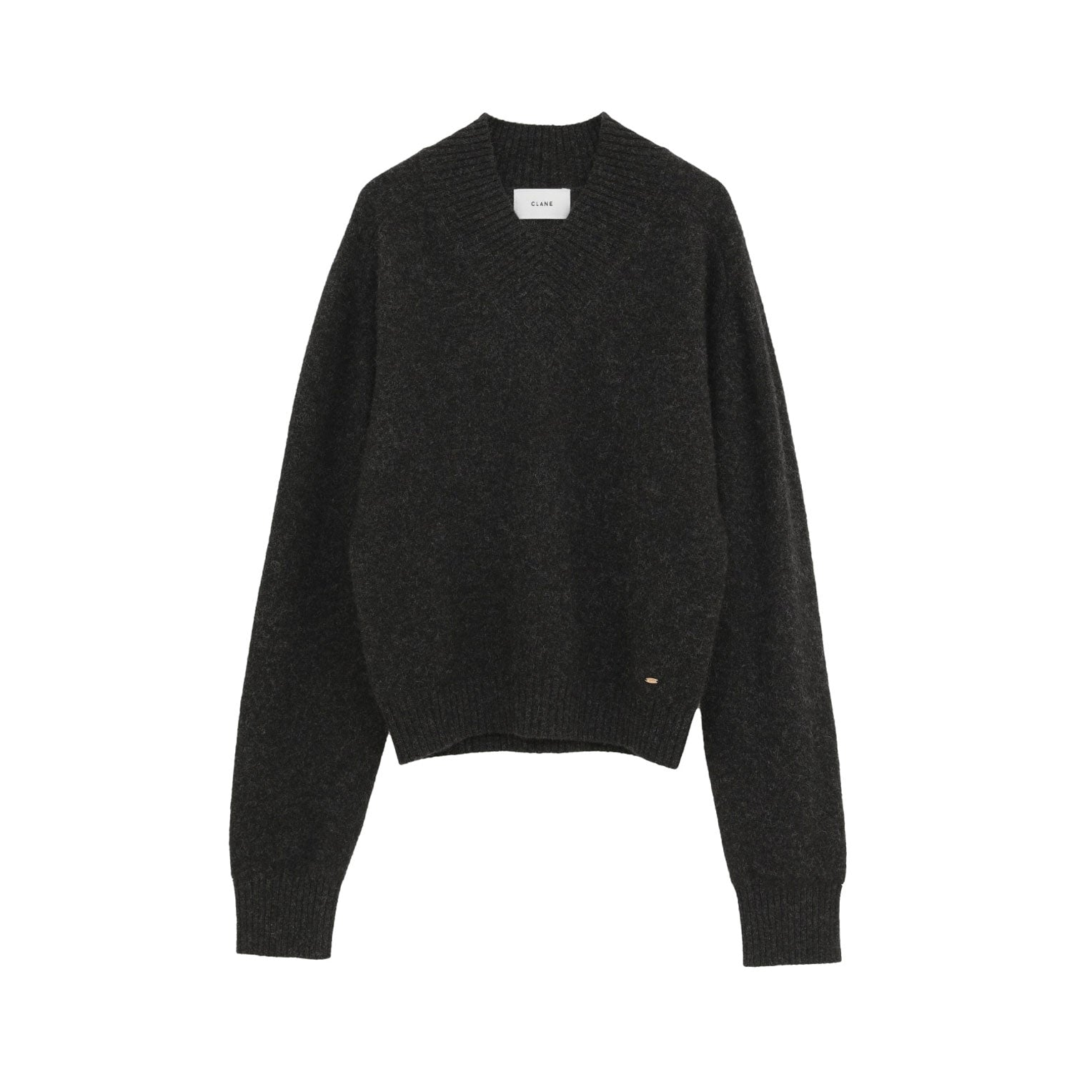 やや襟の高いVネックデザインに、ゆとりのある身幅とコンパクトな丈感がモードな印象を与えます。裾にはCLANEロゴのチャームをさりげなくあしらい、上品なアクセントをプラス。